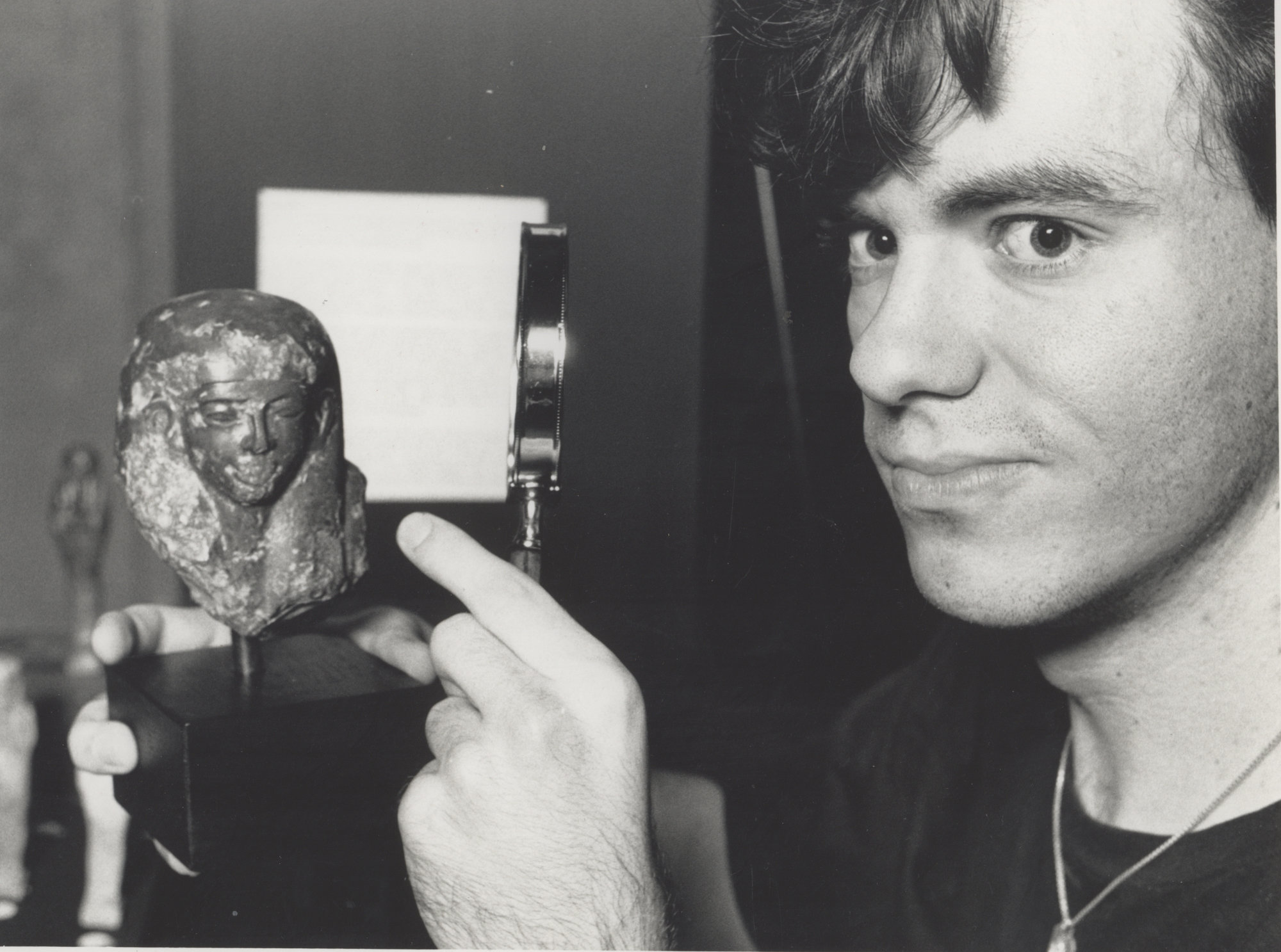 An unidentified man pointing at a statue, the University of Newcastle, Australia - 1990, [P1771-13]. Living Histories, accessed 13/03/2026, https://livinghistories.newcastle.edu.au/nodes/view/45551