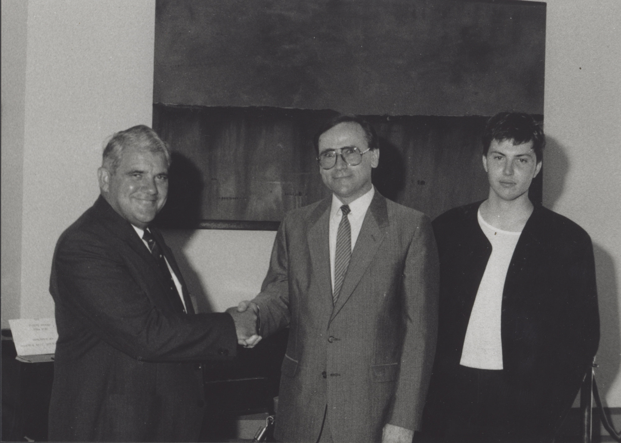 Michael Dudman (Conservatorium Dean) with John Gray (centre) and David Middlebrook (artist) at a presentation at the University of Newcastle, Australia, [P1770-53]. Living Histories, accessed 16/04/2026, https://livinghistories.newcastle.edu.au/nodes/view/46030