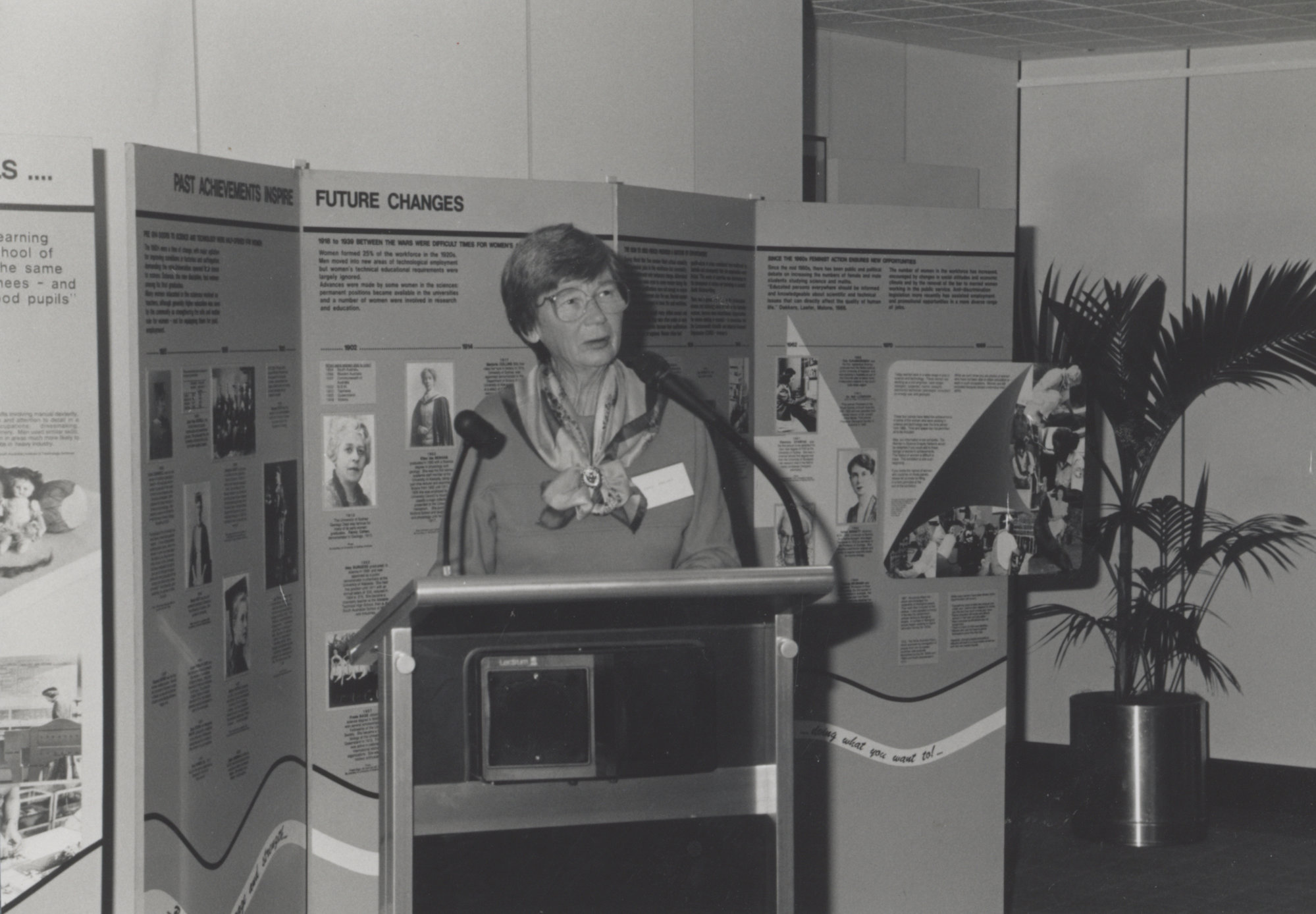 Emeritus Professor Beryl Nashar speaking at the opening of the Women in the Workforce exhibition, the University of Newcastle, Australia - 1989
