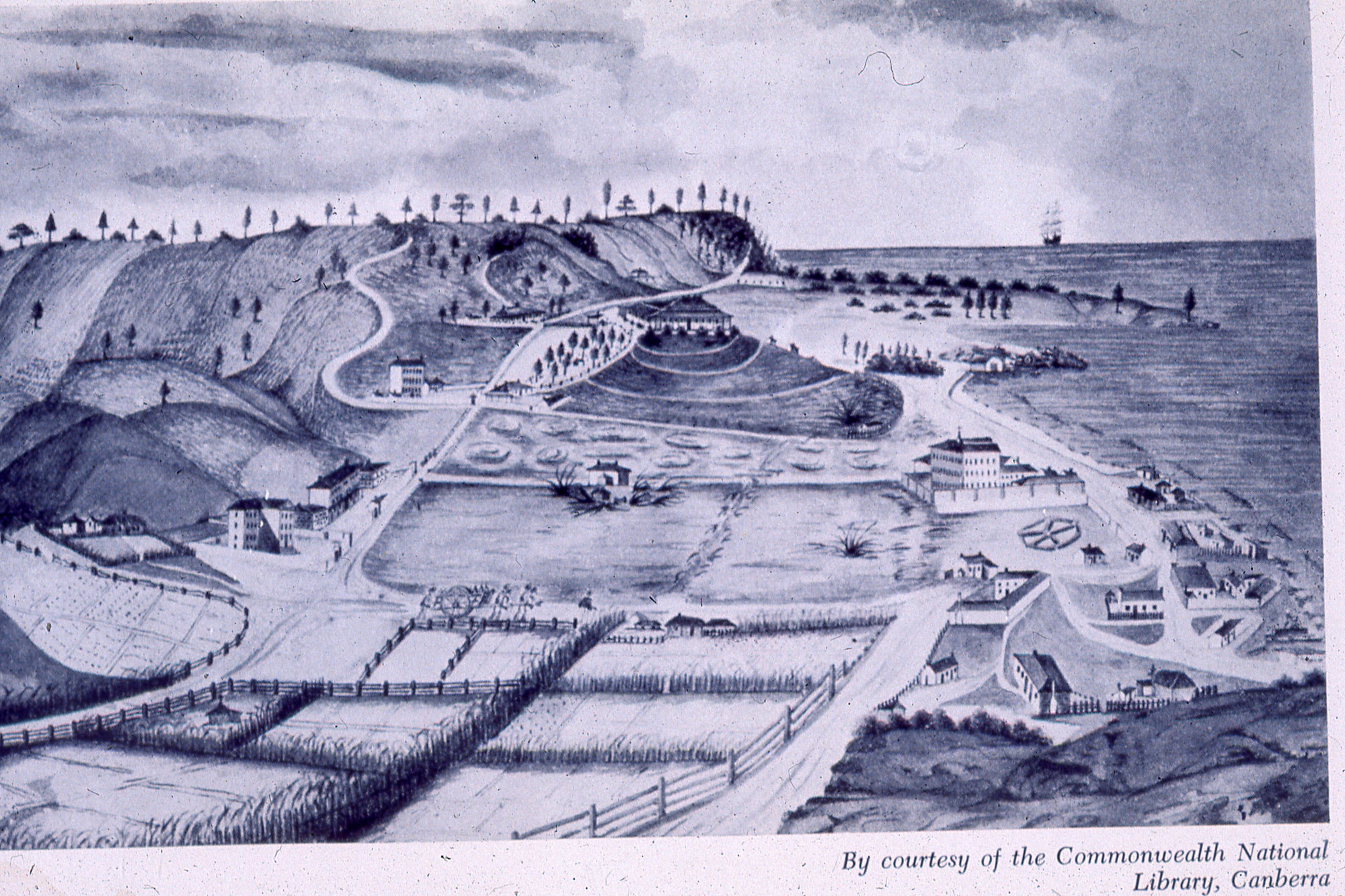 Illustration, Penal Settlement, Norfolk Island, 1835, by Thomas Seller (1835), [C918-0732]. Living Histories, accessed 14/02/2026, https://livinghistories.newcastle.edu.au/nodes/view/4650