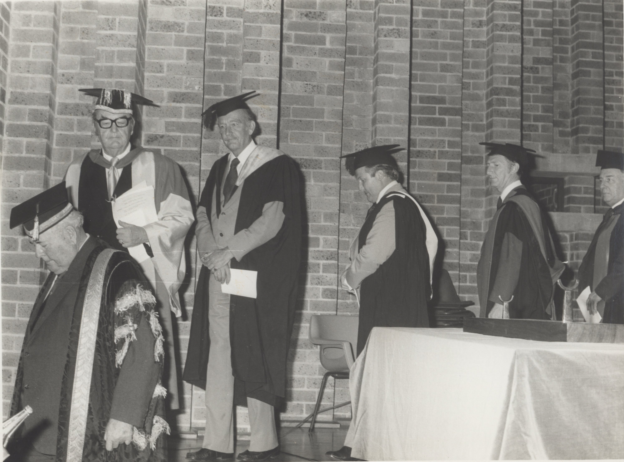 University procession at a graduation ceremony with Chancellor Alister McMullin (leading), Vice-Chancellor Professor James Auchmuty and unidentified academic staff, the University of Newcastle, Australia - c.1973