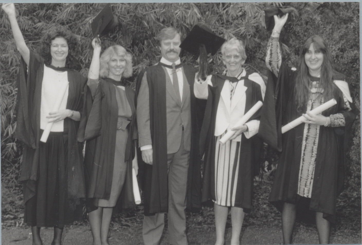 Acting Director of Community Programmes, Mr John Collins with new graduates who commenced their undergraduate degrees from the Open Foundation Course, the University of Newcastle - 1989
