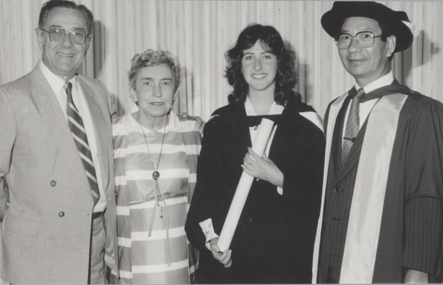 Ms Tamara Raanan returned from overseas to graduate. Her parents and Professor Ono congratulate her, the University of Newcastle, Australia - 1989