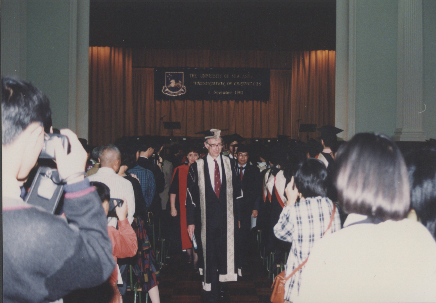 Graduation celebration of Korean students - Vice-Chancellor Keith Morgan leads closing procession [Singapore], the University of Newcastle - 1 November 1992 (1992), [P1753-04f]. Living Histories, accessed 30/03/2026, https://livinghistories.newcastle.edu.au/nodes/view/47223