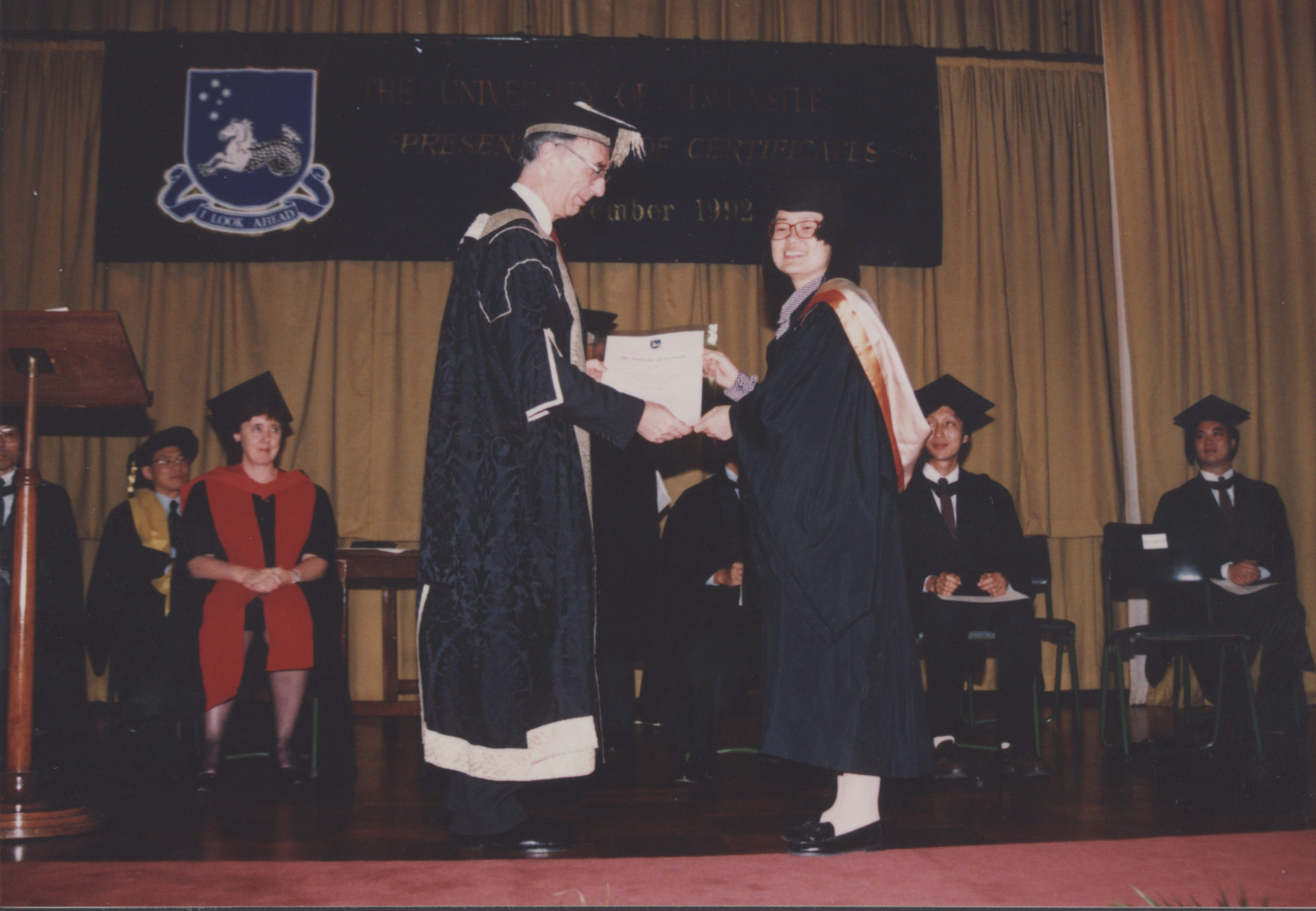 Vice-Chancellor Keith Morgan presents a Korean graduate with her award, the University of Newcastle - 1 November 1992