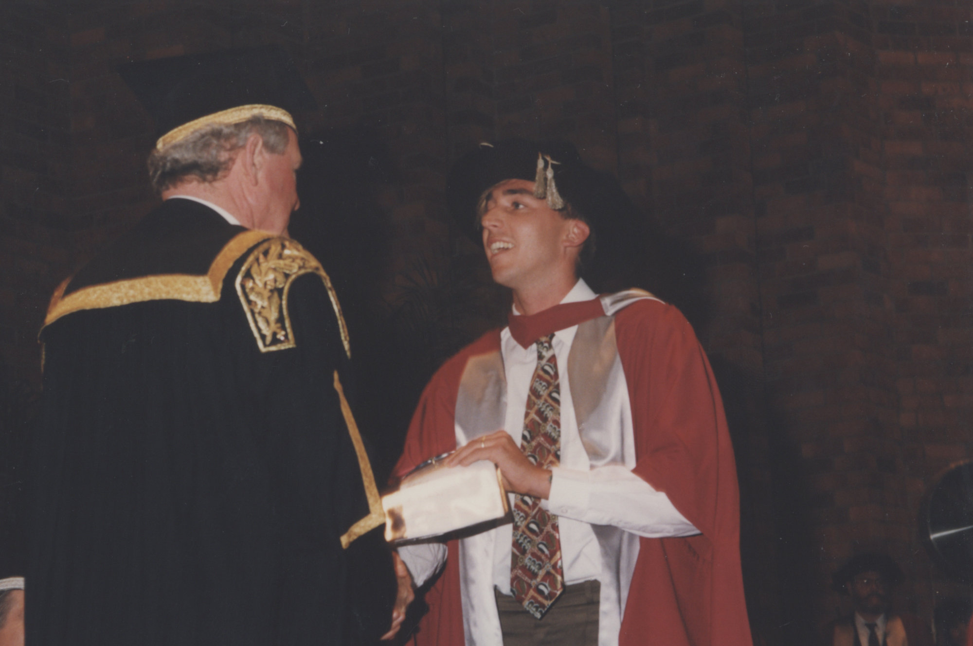 Chancellor Ric Charlton congratulates a graduate at the Faculty of Science / Maths graduation ceremony, the University of Newcastle, Australia - 9 May 1997, 6pm