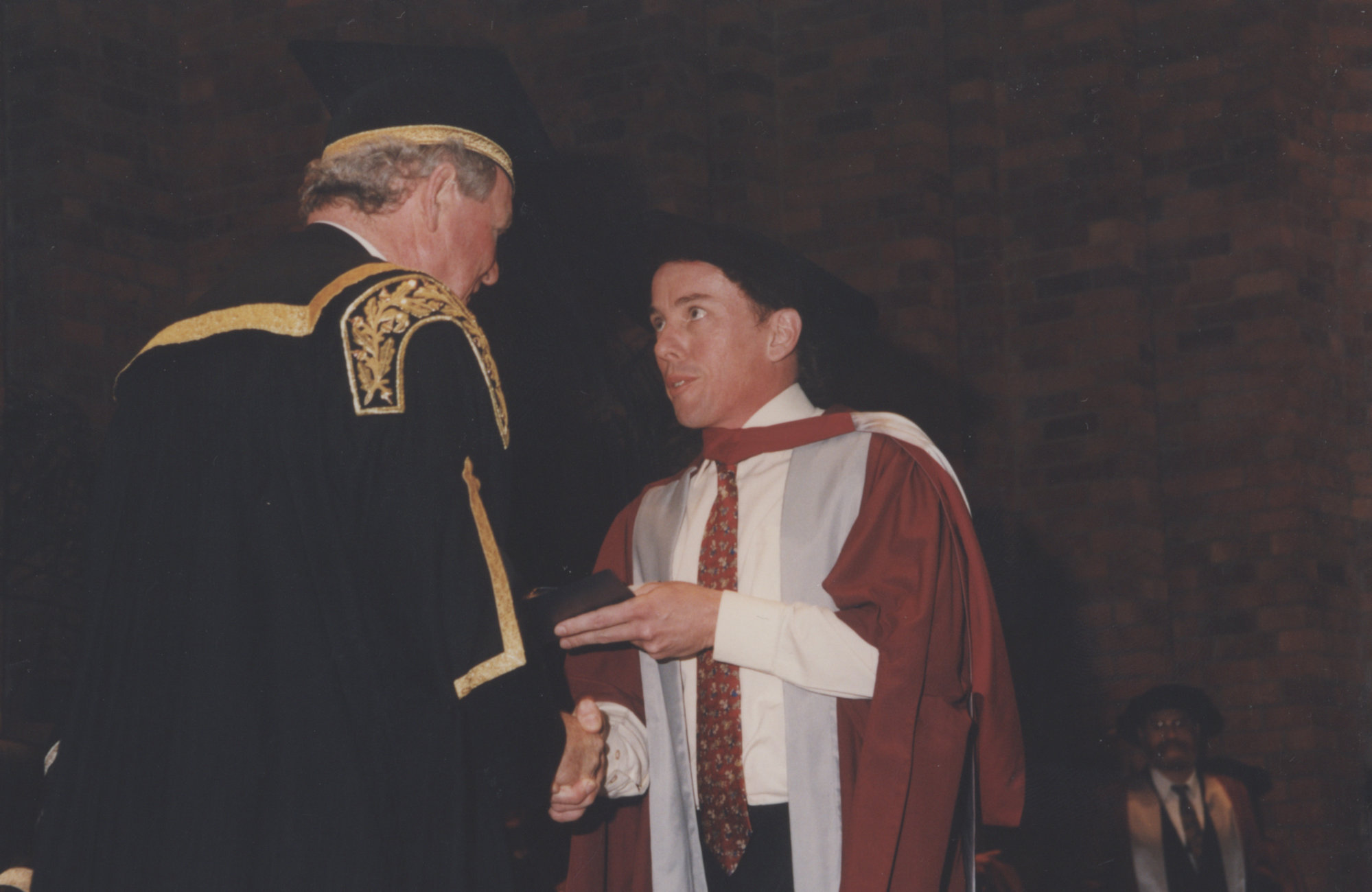 Chancellor Ric Charlton congratulates graduate Bill Landenberger, at the Faculty of Science / Maths graduation ceremony, the University of Newcastle, Australia - 9 May 1997, 6pm (1997-05-09), [P1743-15]. Living Histories, accessed 04/04/2026, https://livinghistories.newcastle.edu.au/nodes/view/47380