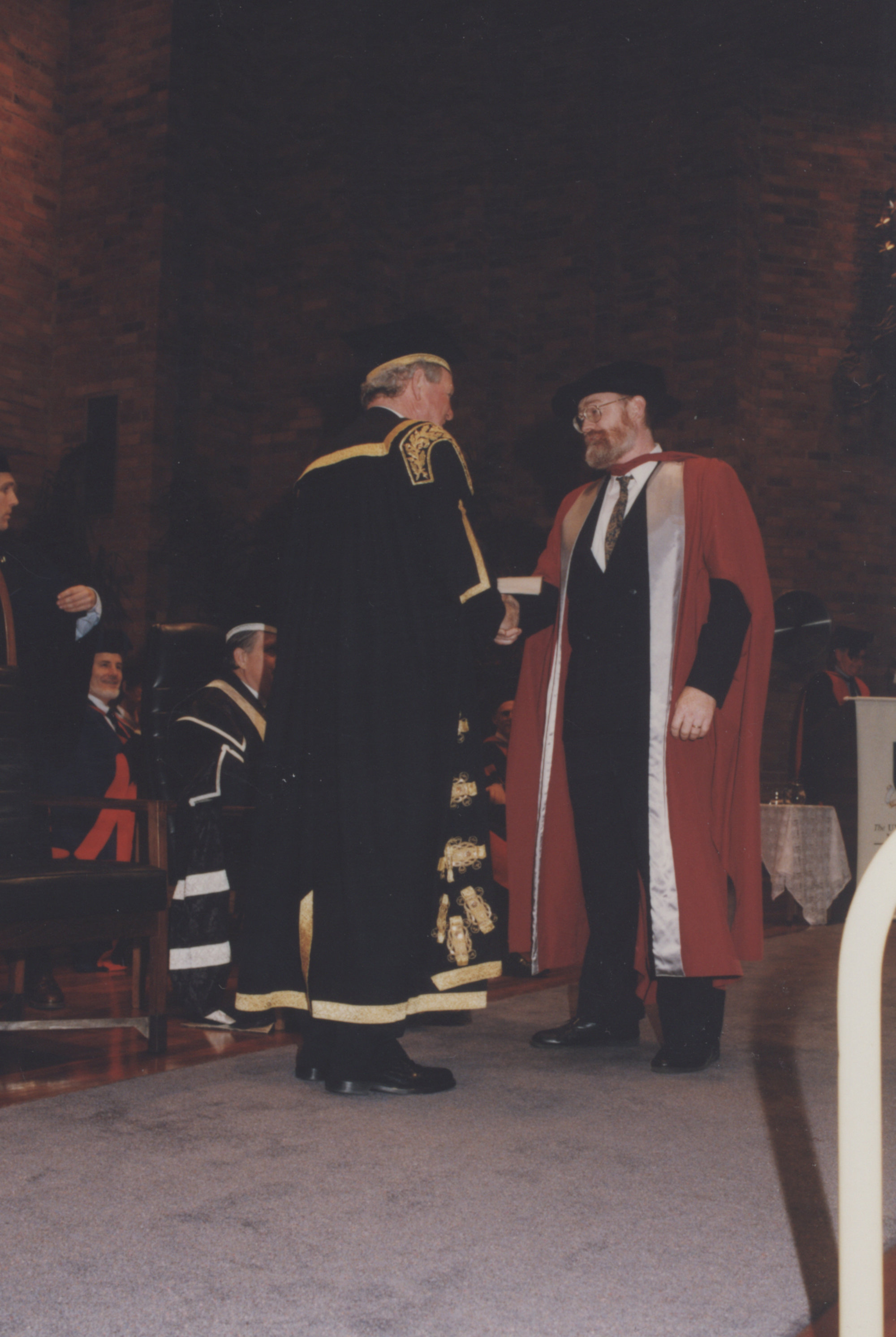 Chancellor Ric Charlton congratulates a graduate at the Faculty of Science / Maths graduation ceremony, the University of Newcastle, Australia - 9 May 1997, 6pm (1997-05-09), [P1743-13]. Living Histories, accessed 04/04/2026, https://livinghistories.newcastle.edu.au/nodes/view/47382