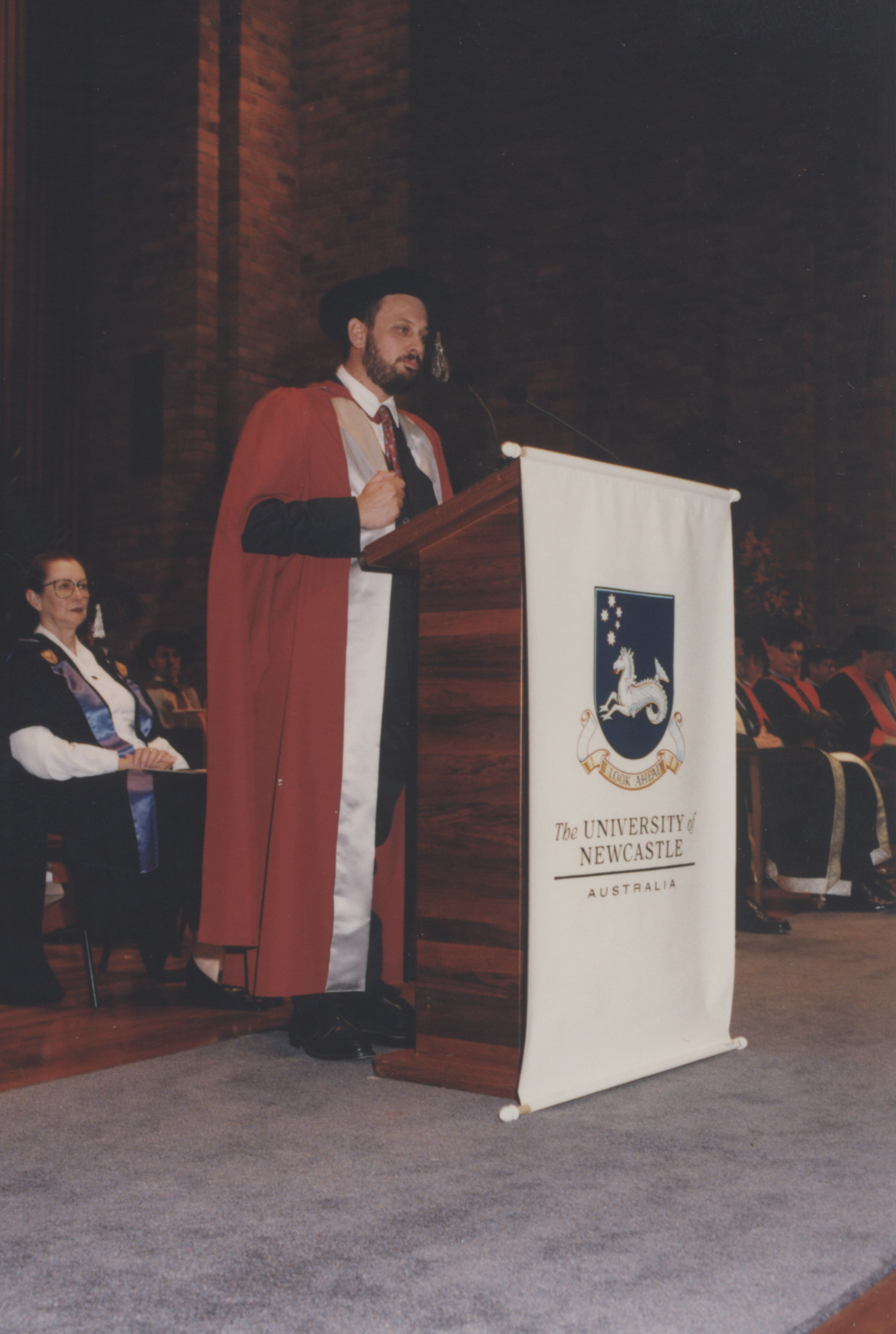 Tim Flannery at the Faculty of Science / Maths graduation ceremony, the University of Newcastle, Australia - 9 May 1997, 6pm (1997-05-09), [P1743-09]. Living Histories, accessed 04/04/2026, https://livinghistories.newcastle.edu.au/nodes/view/47386
