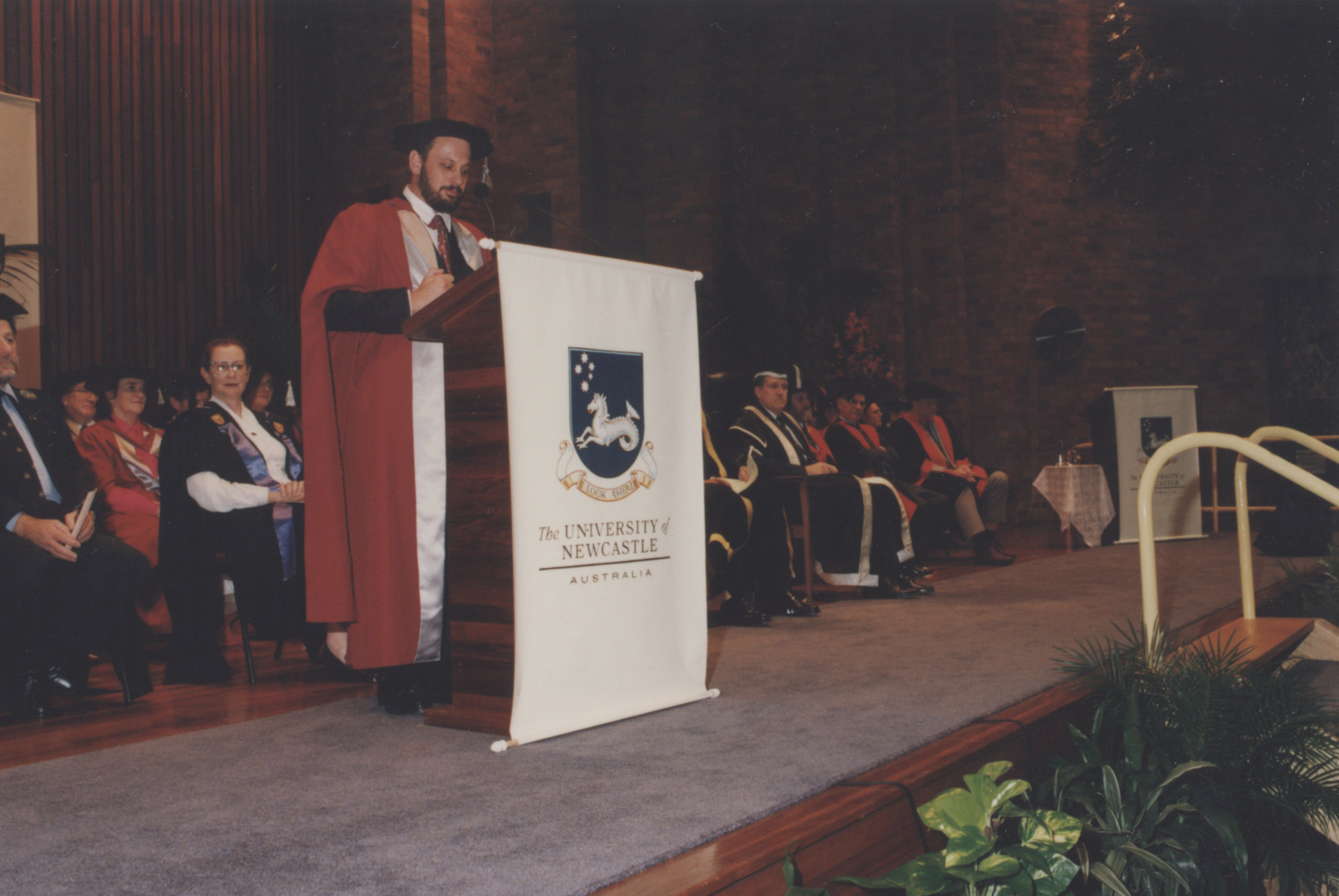 Tim Flannery at the Faculty of Science / Maths graduation ceremony, the University of Newcastle, Australia - 9 May 1997, 6pm (1997-05-09), [P1743-08]. Living Histories, accessed 04/04/2026, https://livinghistories.newcastle.edu.au/nodes/view/47387