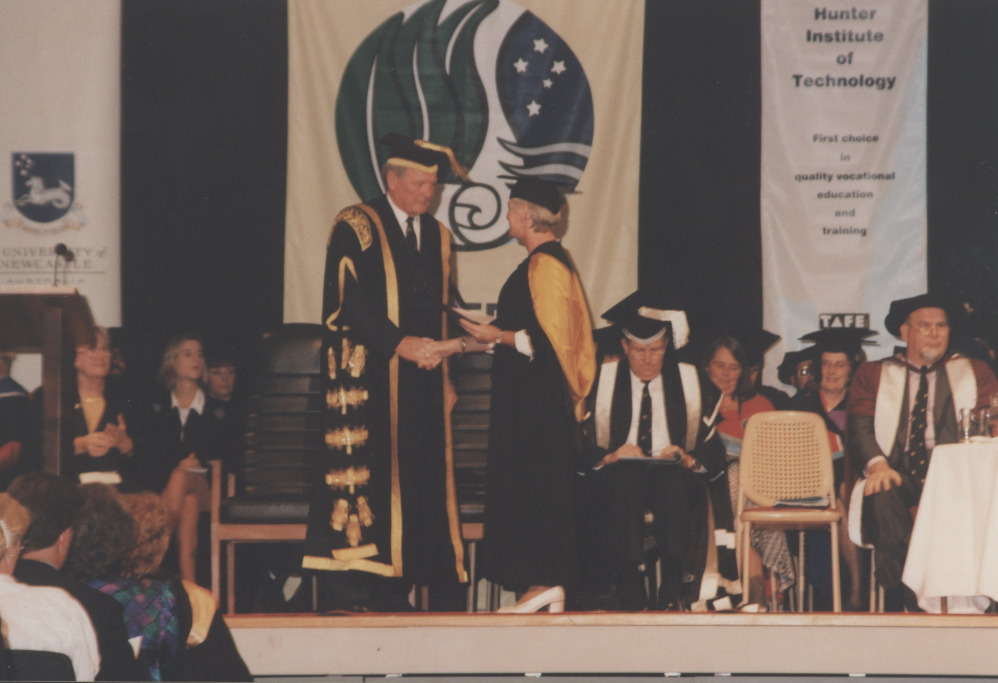 A female graduand is congratulated by Chancellor Ric Charlton at the Central Coast graduation ceremony for university and TAFE students, the University of Newcastle, Australia - 1 May 1997, 2.30pm (1997-05-01), [P1746-21]. Living Histories, accessed 06/03/2026, https://livinghistories.newcastle.edu.au/nodes/view/47429