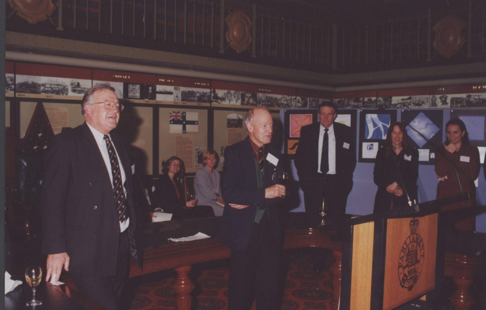 Official University Function, attended by the Vice-Chancellor, Roger Holmes (background right) with Godfrey Tanner (centre) and Bernie Curran (left), Parliament House, NSW, Australia - c.1999 (1999), [P1815]. Living Histories, accessed 04/04/2026, https://livinghistories.newcastle.edu.au/nodes/view/47858
