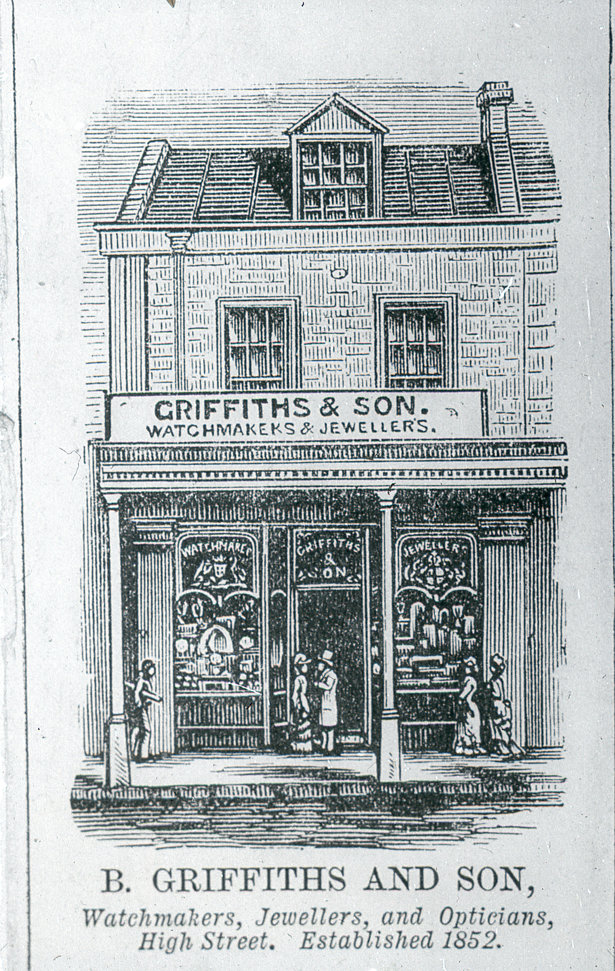 Illustration, B Griffiths and Son, watchmakers, jewellers and opticians, High Street [Maitland, NSW], est 1852 (1852), [C918-0616]. Living Histories, accessed 19/03/2026, https://livinghistories.newcastle.edu.au/nodes/view/4804