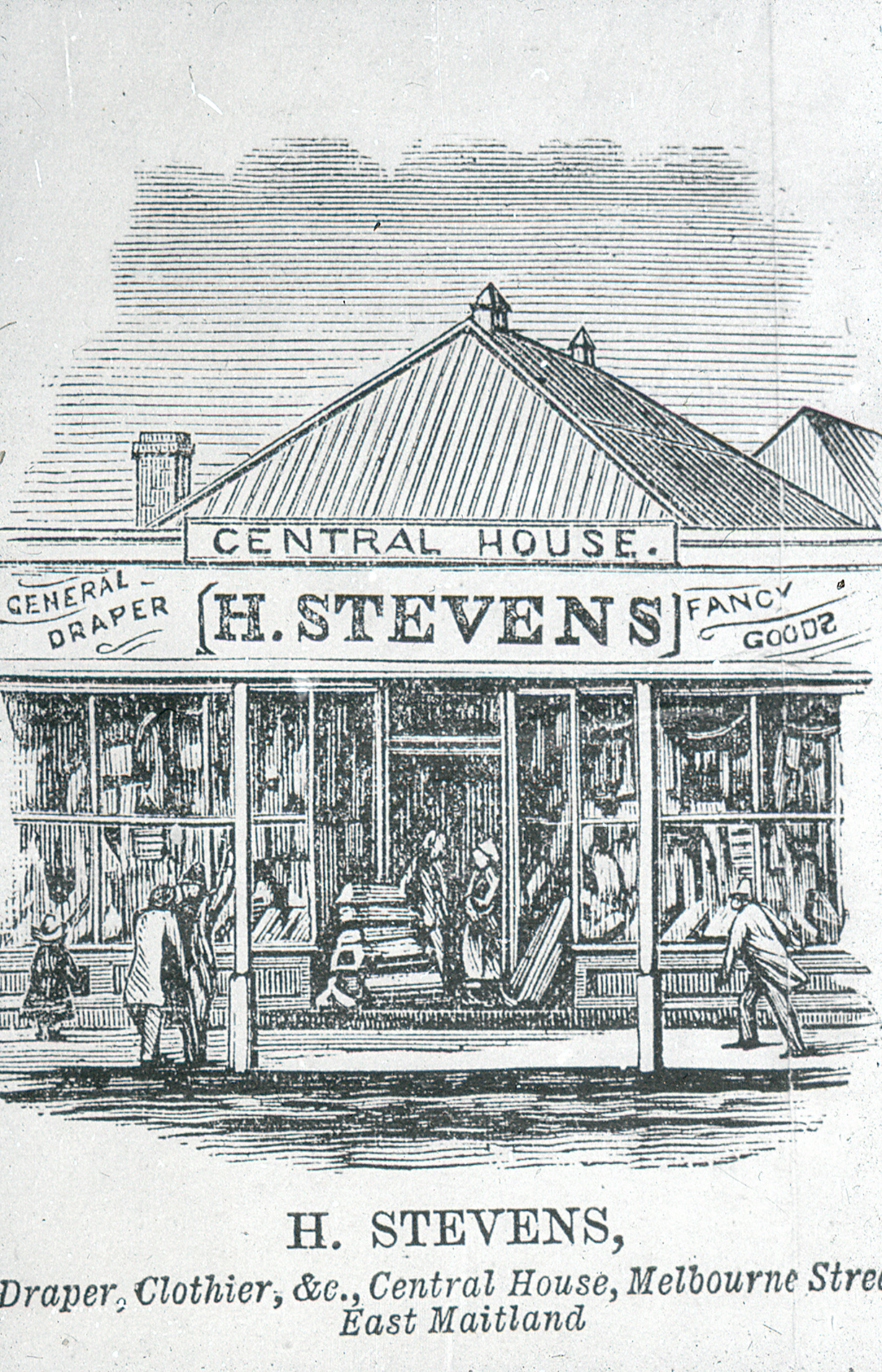 Illustration, H Stevens, draper, clothier, etc, Central House, Melbourne Street, East Maitland, NSW, [C918-0610]. Living Histories, accessed 08/02/2026, https://livinghistories.newcastle.edu.au/nodes/view/4810