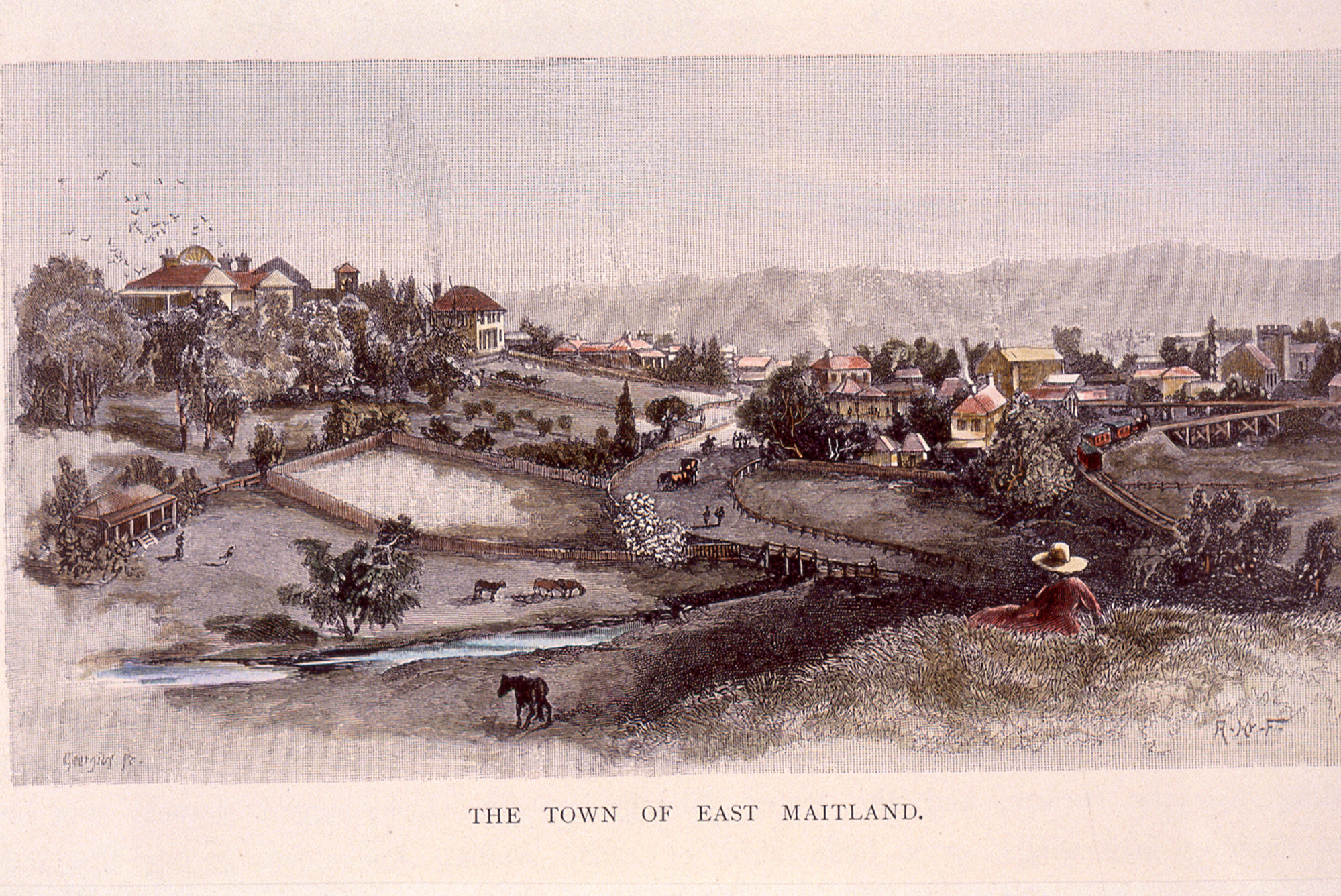 Illustration, The town of East Maitland, [C918-0601]. Living Histories, accessed 09/02/2026, https://livinghistories.newcastle.edu.au/nodes/view/4819