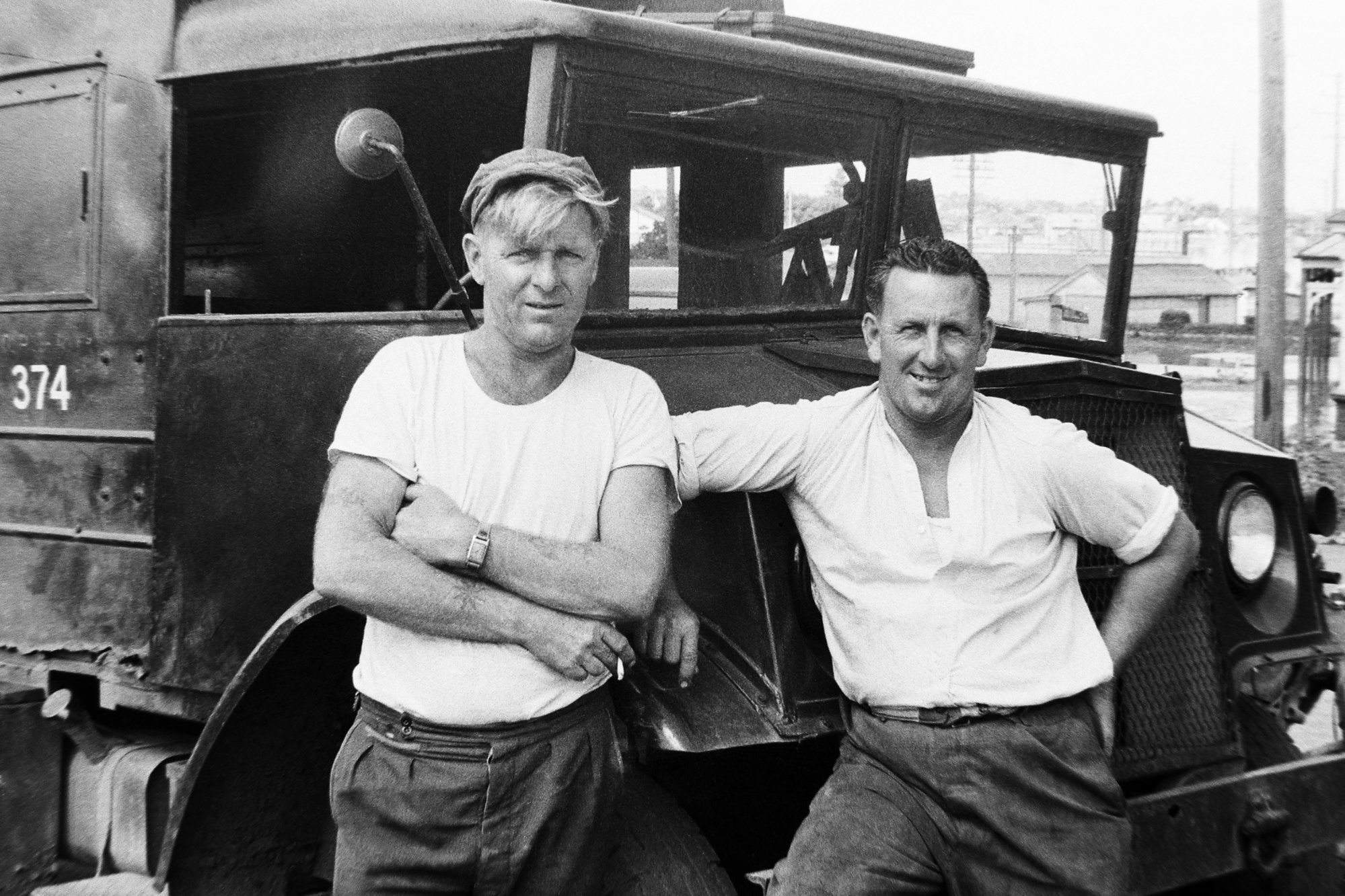 Two gentlemen pictured in front of a truck during the Maitland floods, 1955: Lucey Collection