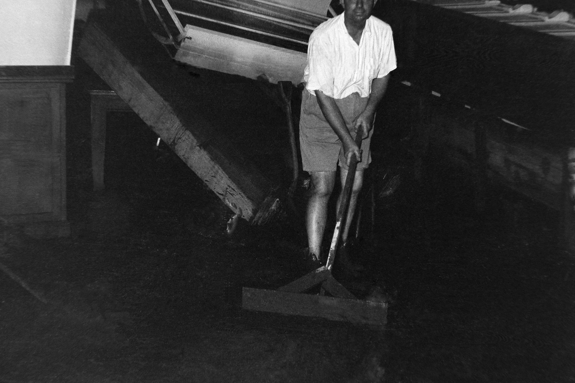 Lucey, Jim, A man sweeps up flood damage from the Maitland Flood, 1955: Lucey Collection (1955), [Film03-29]. Living Histories, accessed 01/04/2026, https://livinghistories.newcastle.edu.au/nodes/view/48346