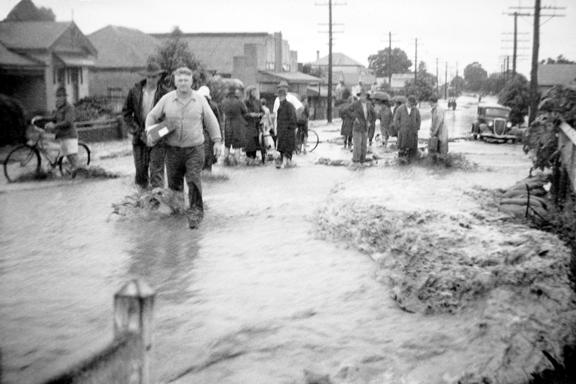 Lucey, Jim, People wading through flooded street during the Maitland Flood, 1955: Lucey Collection (1955), [Film02-23]. Living Histories, accessed 01/04/2026, https://livinghistories.newcastle.edu.au/nodes/view/48388