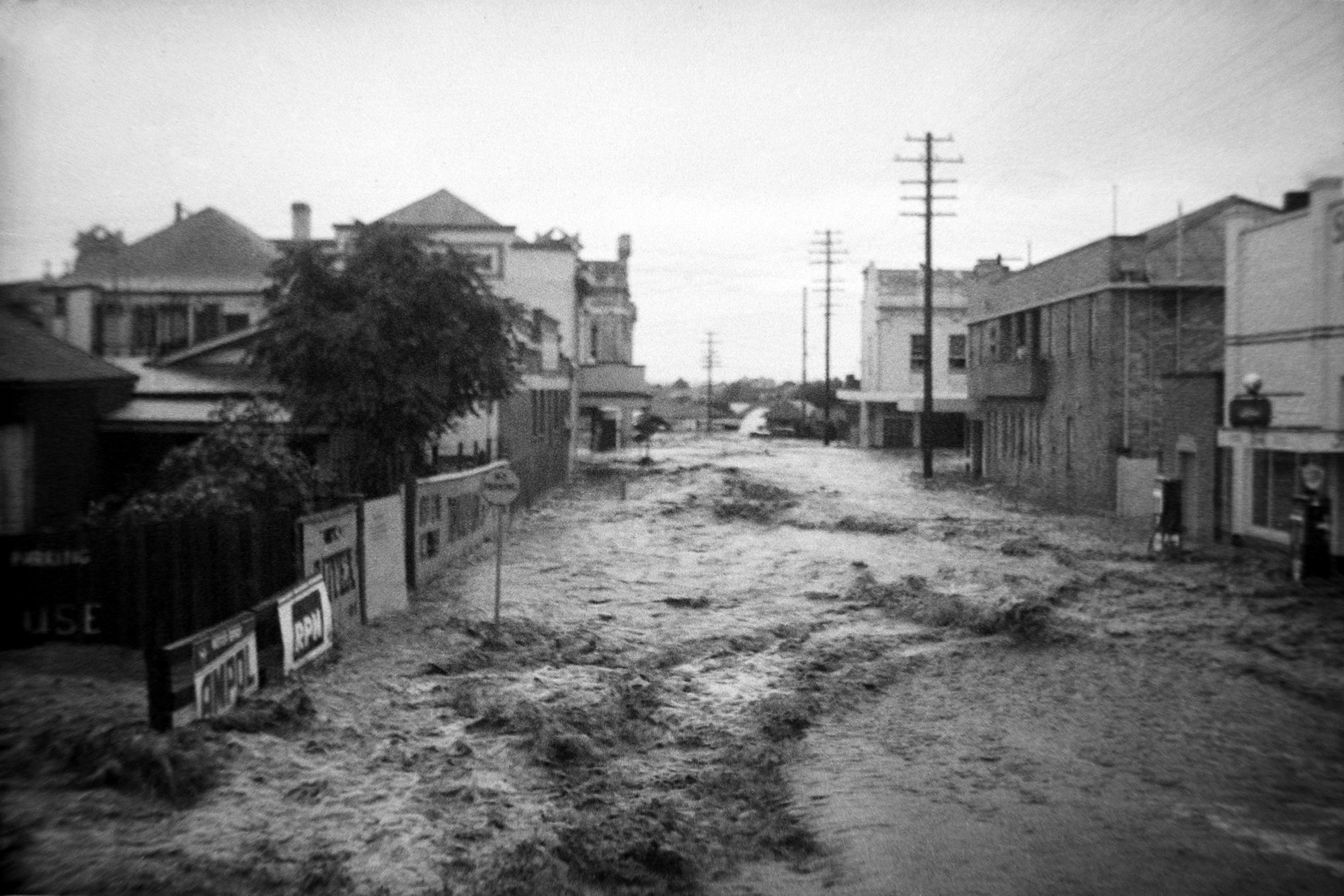 Lucey, Jim, Flooded street during the Maitland Flood, 1955: Lucey Collection (1955), [Film02-19]. Living Histories, accessed 01/04/2026, https://livinghistories.newcastle.edu.au/nodes/view/48392