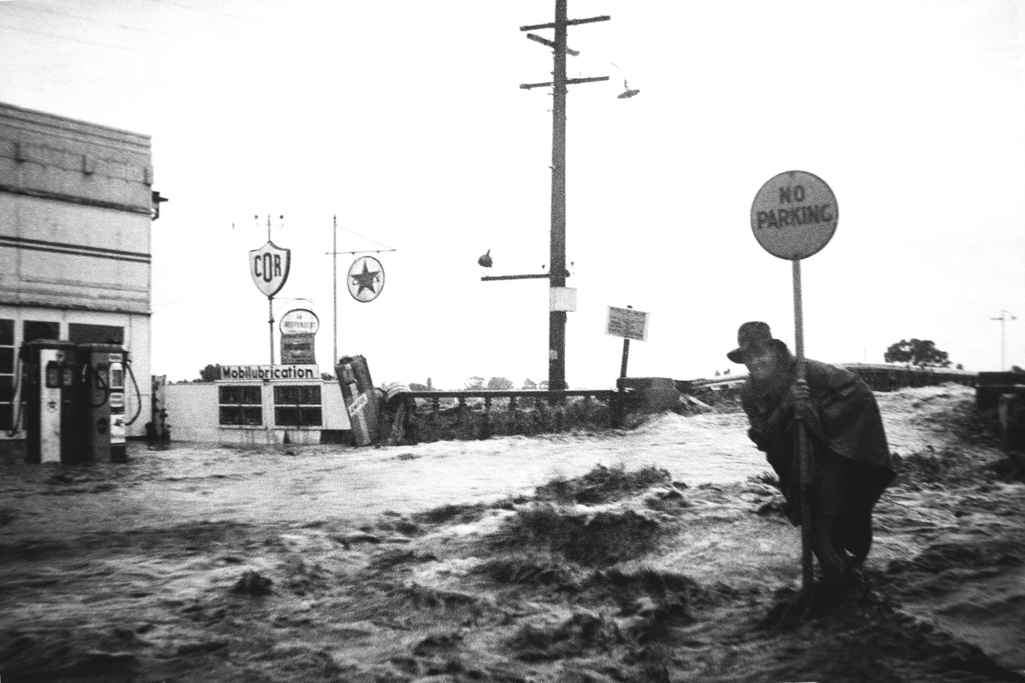 Man holding "no parking" sign near a service station during the Maitland Flood, 1955: Lucey Collection