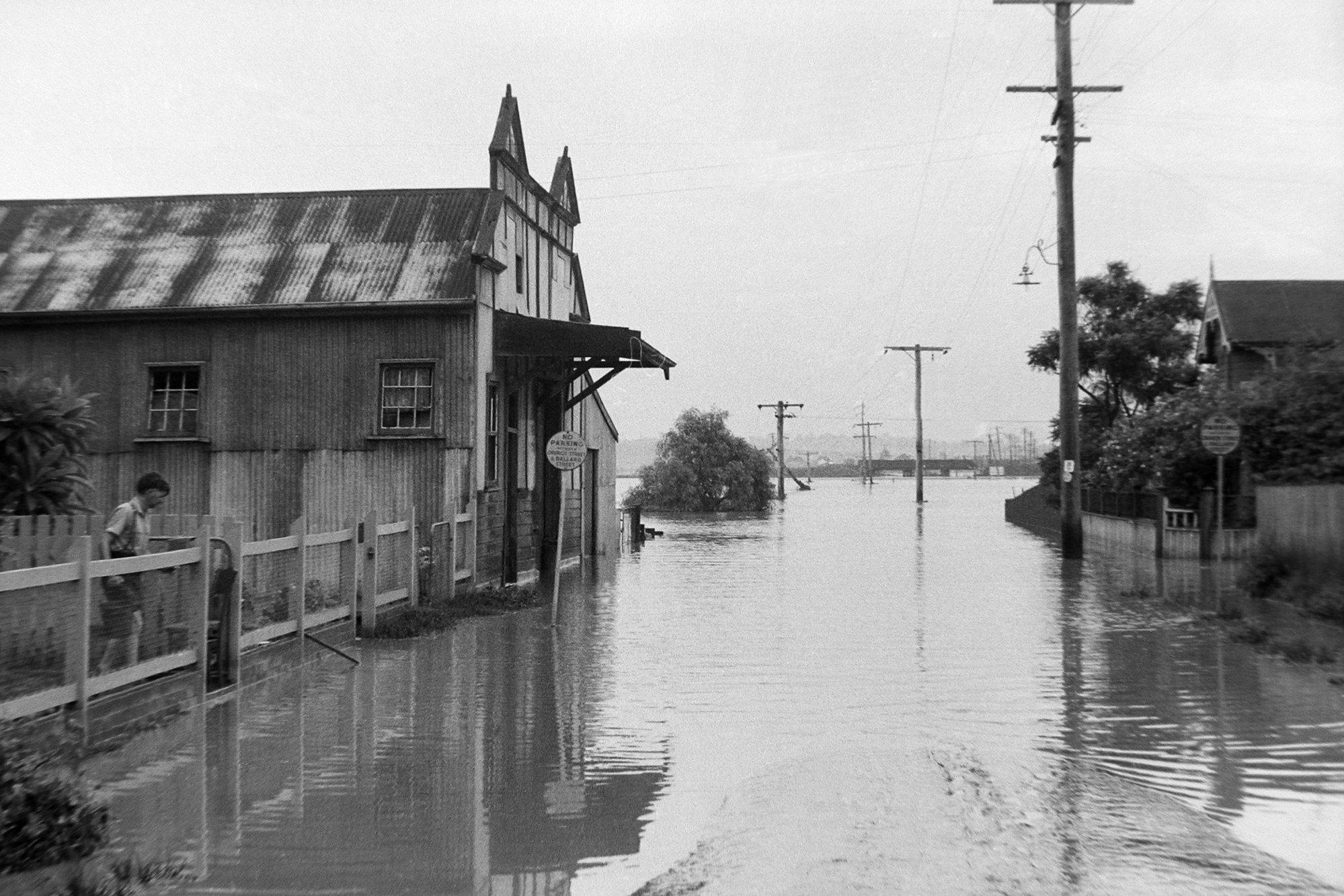 Lucey, Jim, Flooded street during the Maitland Flood, 1955. Lucey Collection (1955), [Film01-32]. Living Histories, accessed 01/04/2026, https://livinghistories.newcastle.edu.au/nodes/view/48416