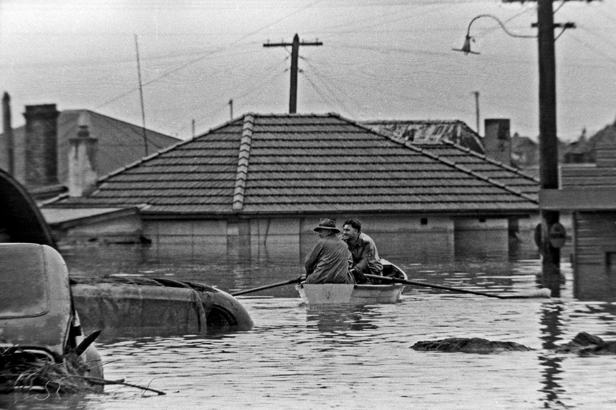 Lucey, Jim, Two men inspect the damage of the floods from a row boat, 1955. Lucey Collection (1955), [Film01-15]. Living Histories, accessed 01/04/2026, https://livinghistories.newcastle.edu.au/nodes/view/48433