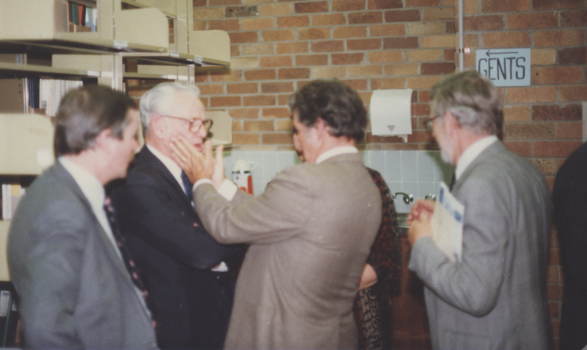 Neil Radford, Harrison Bryan, Ted and Pat Flowers with an unidentified gentleman, at the 500,000th book presentation, Auchmuty Library, the University of Newcastle, Australia - 10 August 1984