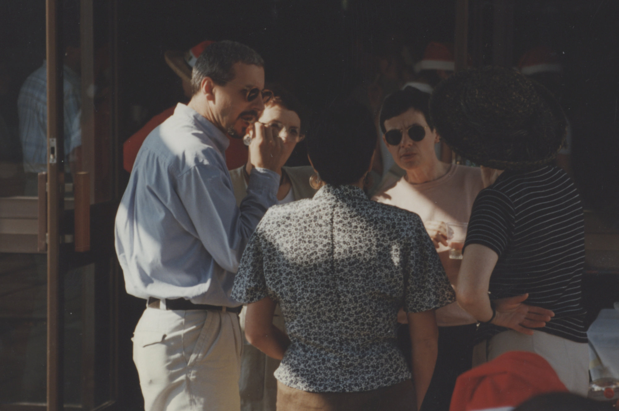 Peter Sidorko, Kaye Suters, Brownwyn Nelson (back to camera) Anne Robinson, Charmian Eckersley (hand on hips) - at a Library Christmas Party, Auchmuty Library Roof Garden, the University of Newcastle, Australia - 1997