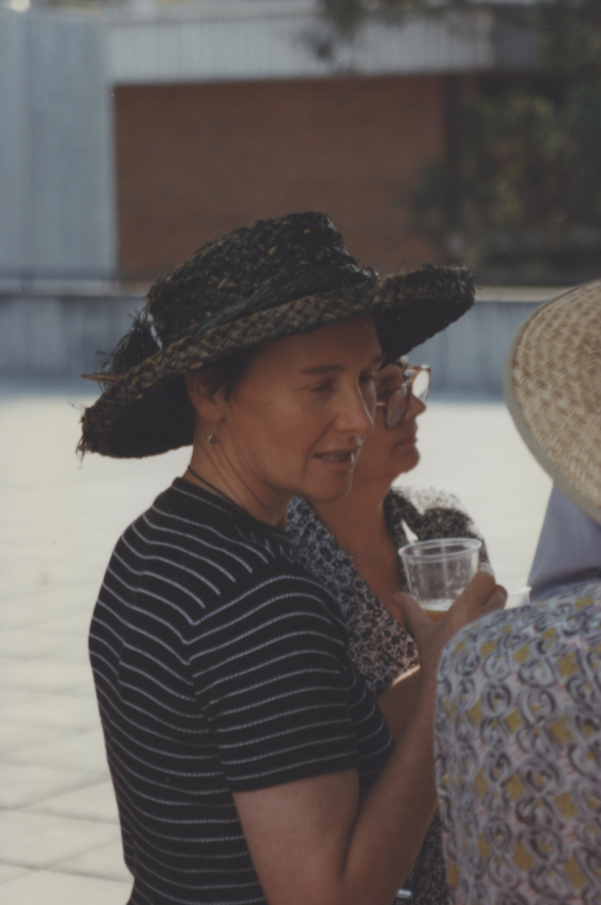 Charmian Eckersley and Bronwyn Nelson (back to camera) at a Library Christmas Party, Auchmuty Library Roof Garden, the University of Newcastle, Australia - 1997