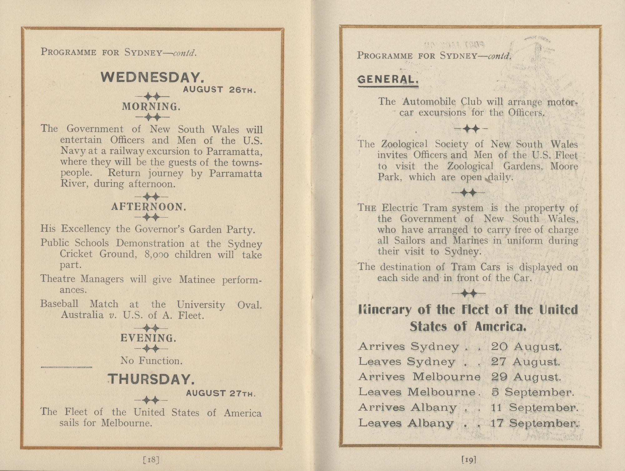 Pages 18 & 19 - Programme for Sydney - Visit of the Fleet of the USA. Living Histories, accessed 17/04/2026, https://livinghistories.newcastle.edu.au/nodes/view/49742