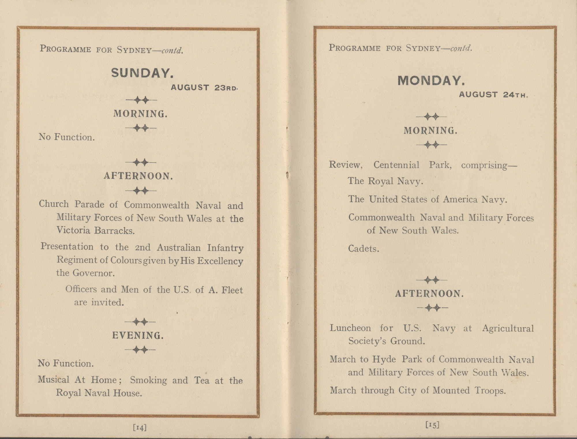 Pages 14 & 15 - Programme for Sydney - Visit of the Fleet of the USA. Living Histories, accessed 17/04/2026, https://livinghistories.newcastle.edu.au/nodes/view/49744