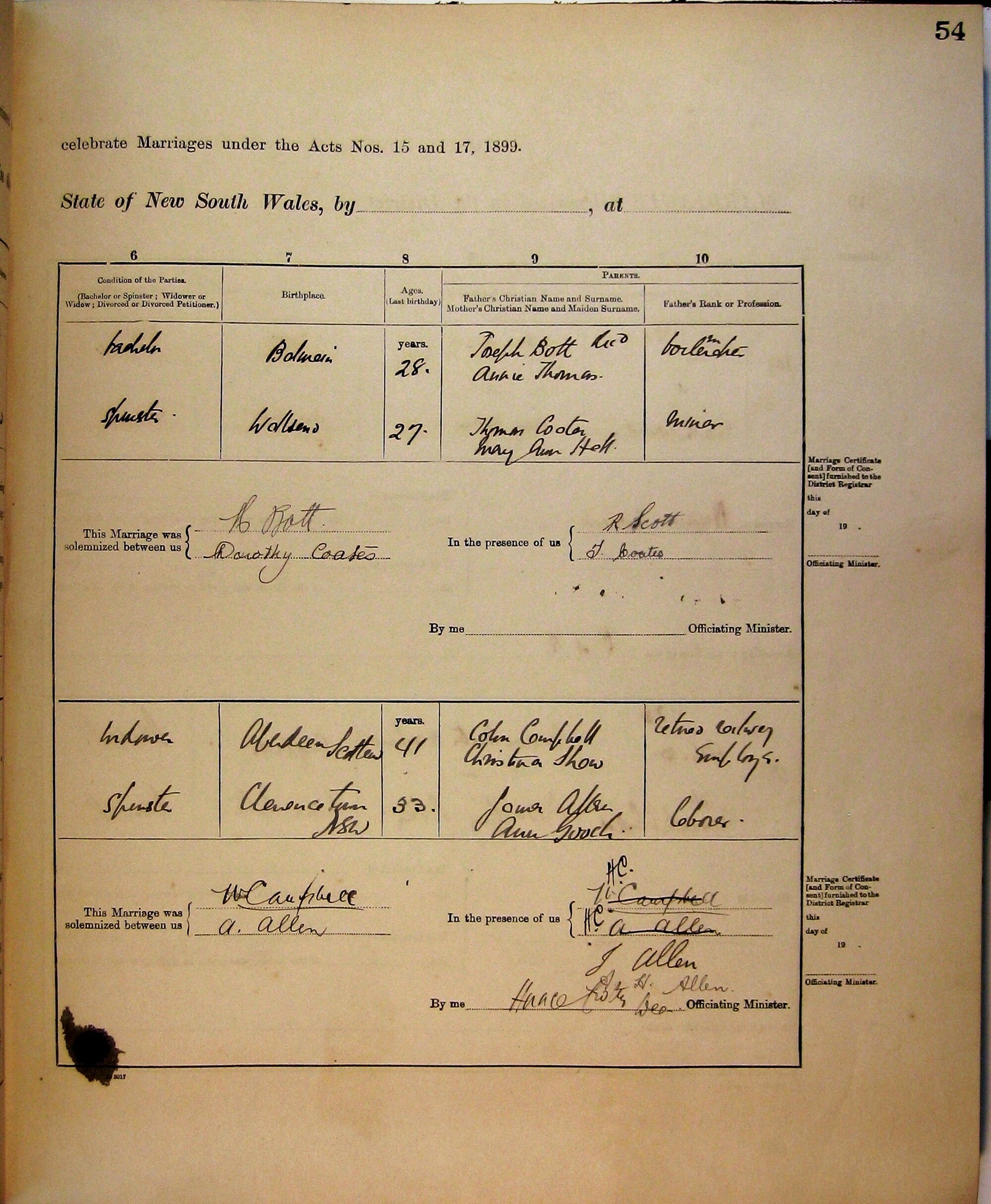 Marriages Numbers 107a and 108a, Page 54a. 1922. Living Histories, accessed 29/04/2026, https://livinghistories.newcastle.edu.au/nodes/view/50625