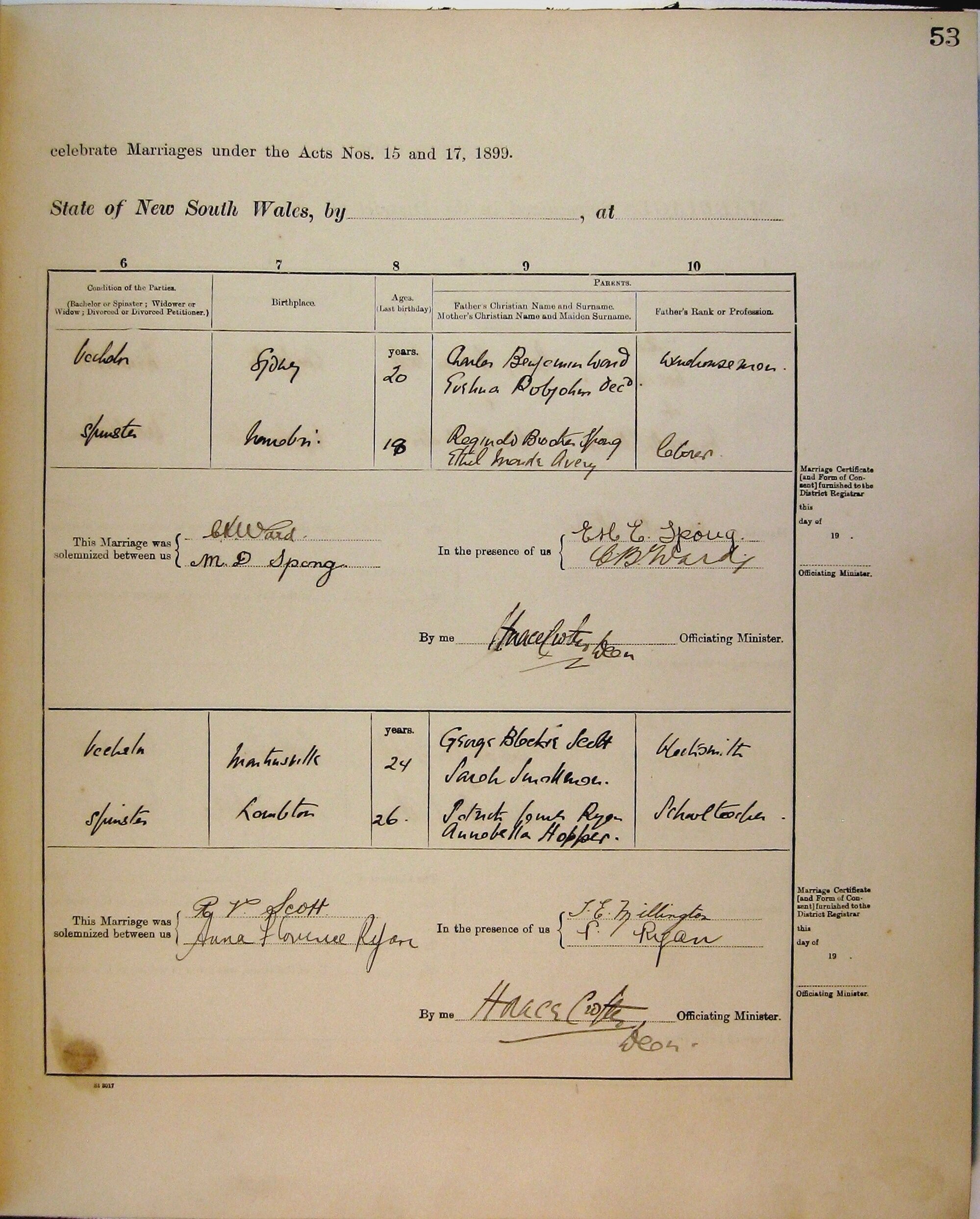 Marriages Numbers 105a and 106a, Page 53a. 1922. Living Histories, accessed 29/04/2026, https://livinghistories.newcastle.edu.au/nodes/view/50627
