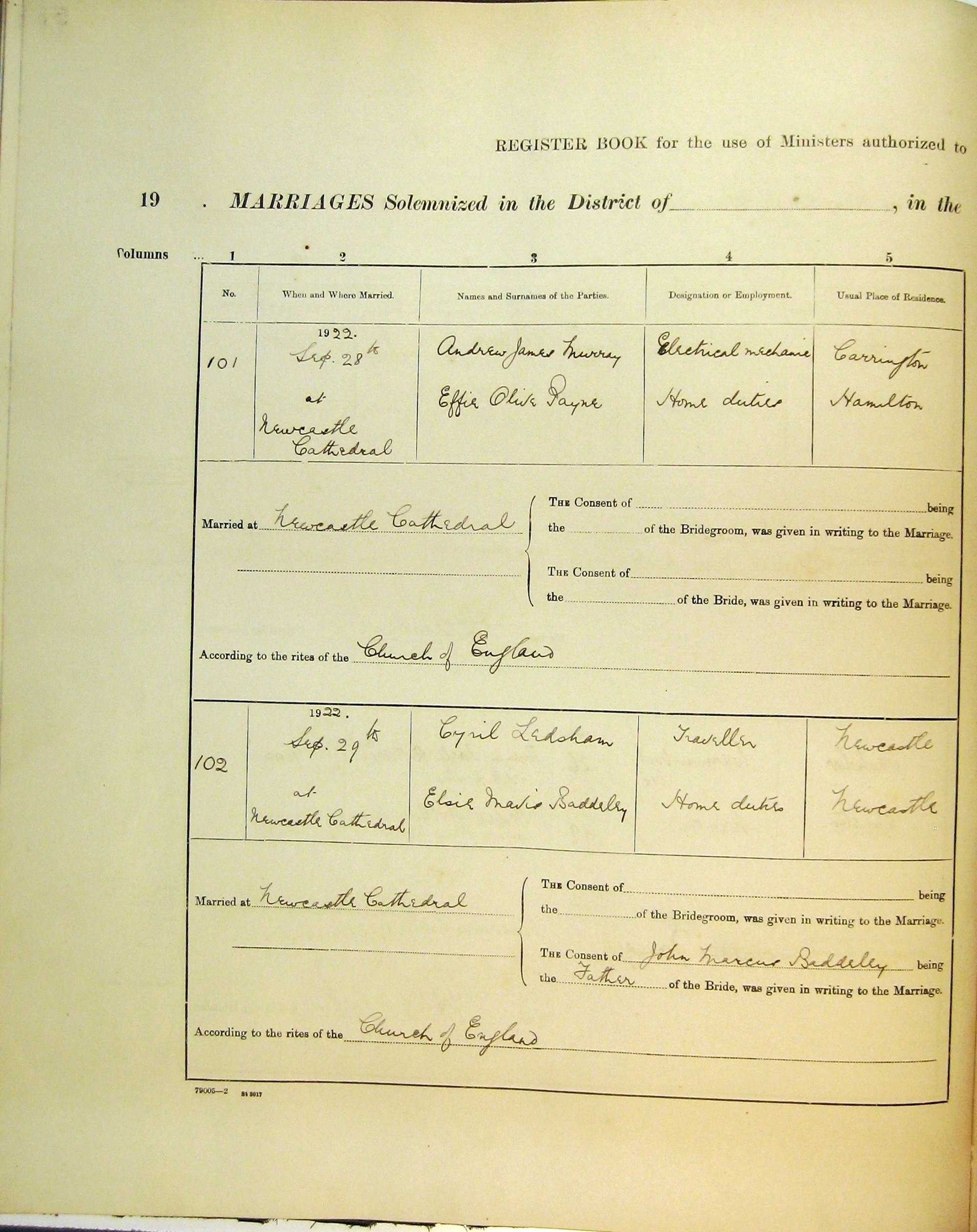 Marriages Numbers 101 and 102, Page 51. 1922