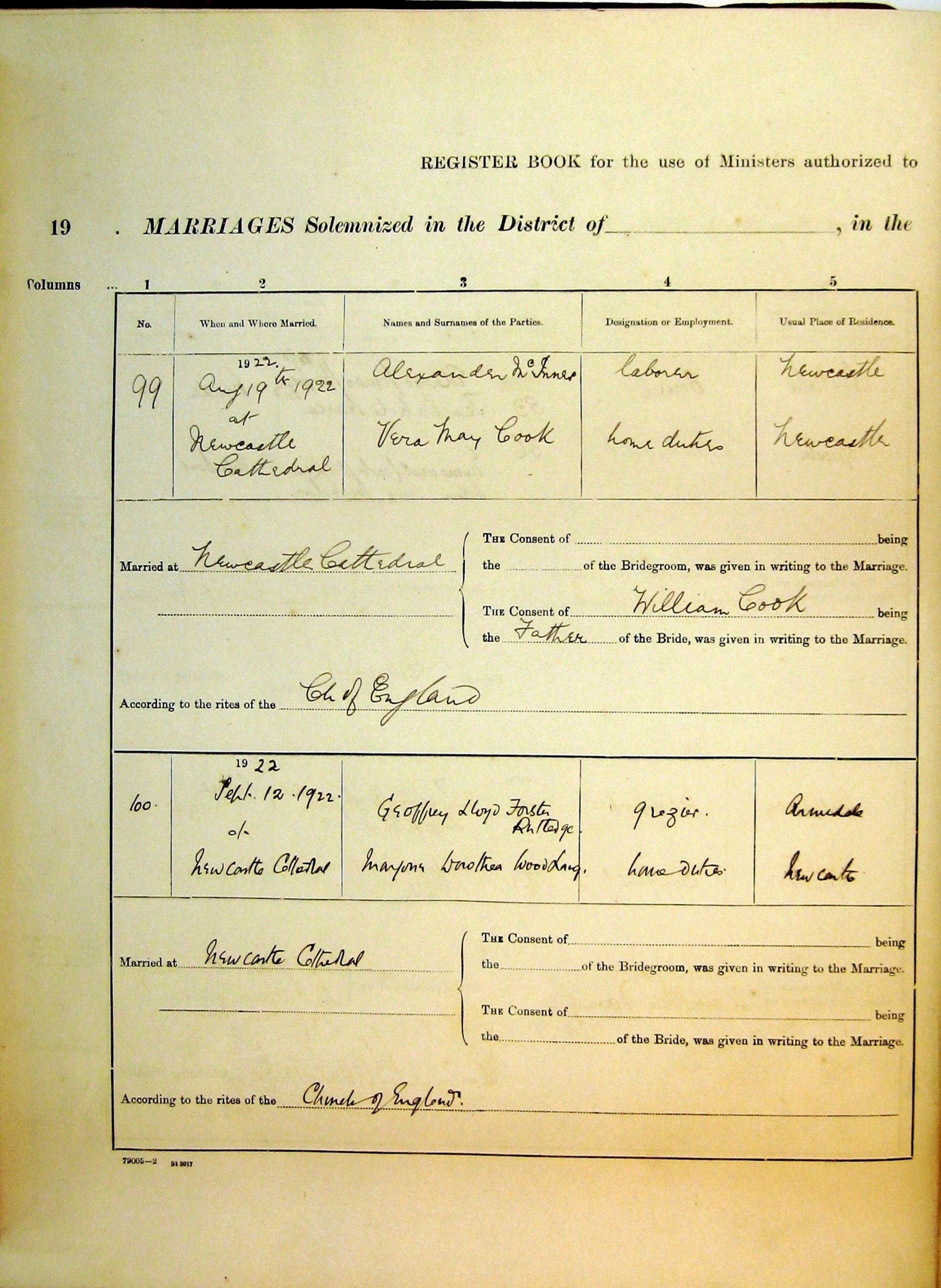 Marriages Numbers 99 and 100, Page 50. 1922