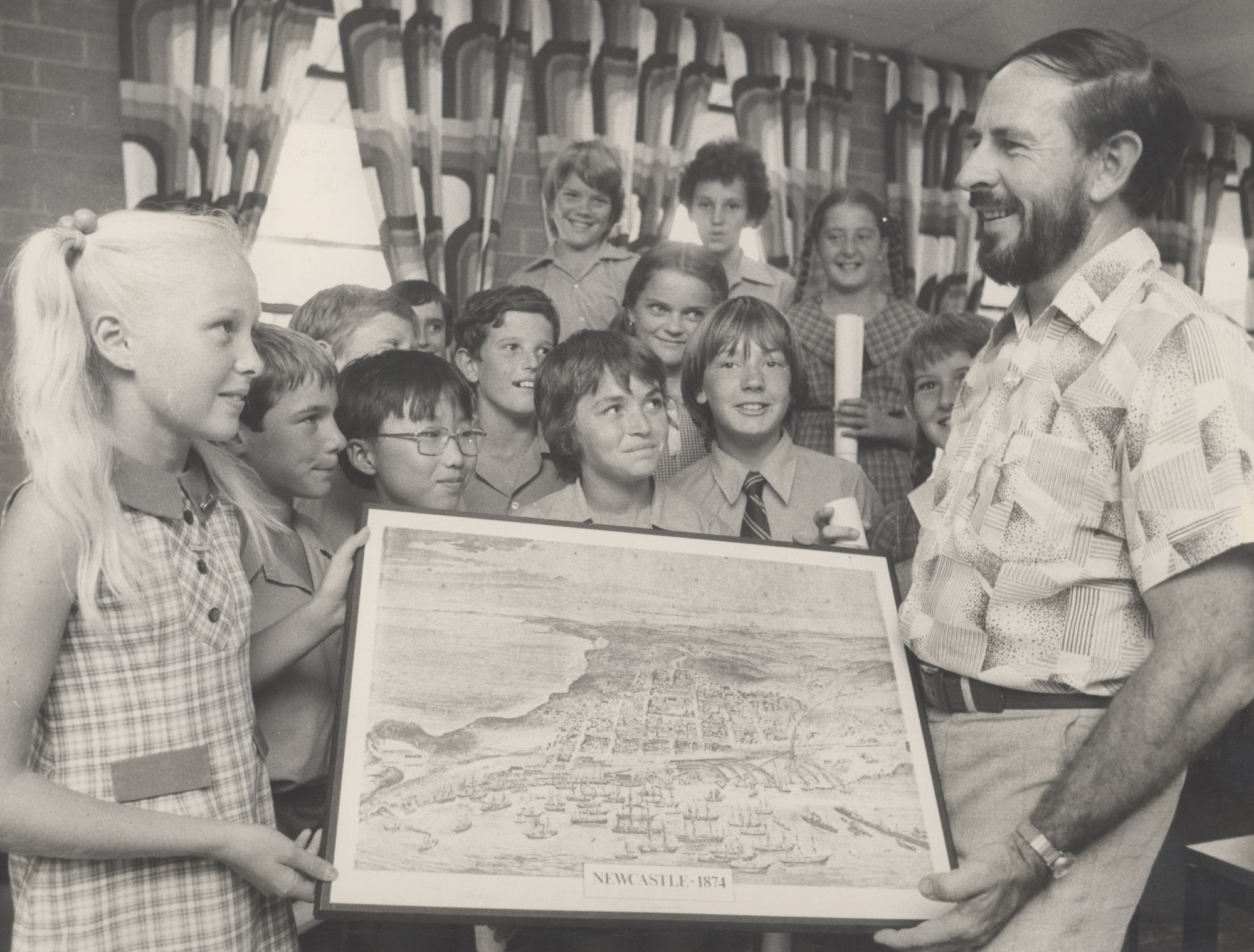 Dr. John Turner presents a lithograph of Newcastle in 1874 to Anissa Lockwood., [P800-1]. Living Histories, accessed 24/03/2026, https://livinghistories.newcastle.edu.au/nodes/view/51100