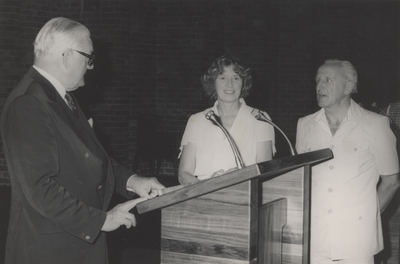 Presentation of new lecterns presented to the University by Mr and Mrs Alan Tweedie - accepting them is Sir Bede Callaghan, the University of Newcastle, Australia - 1981 (1981), [P799B-75a]. Living Histories, accessed 07/02/2026, https://livinghistories.newcastle.edu.au/nodes/view/51125