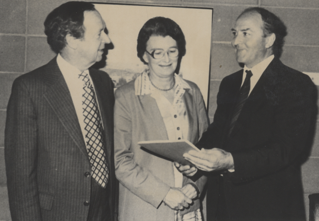 Principal of Muswellbrook High School, Mr. I. Kinny, Principal of Maitland Girls High School, Miss W. Andrew, and deputy Chairman of Senate Professor Michael Carter, [P799B-70a]. Living Histories, accessed 15/04/2026, https://livinghistories.newcastle.edu.au/nodes/view/51135