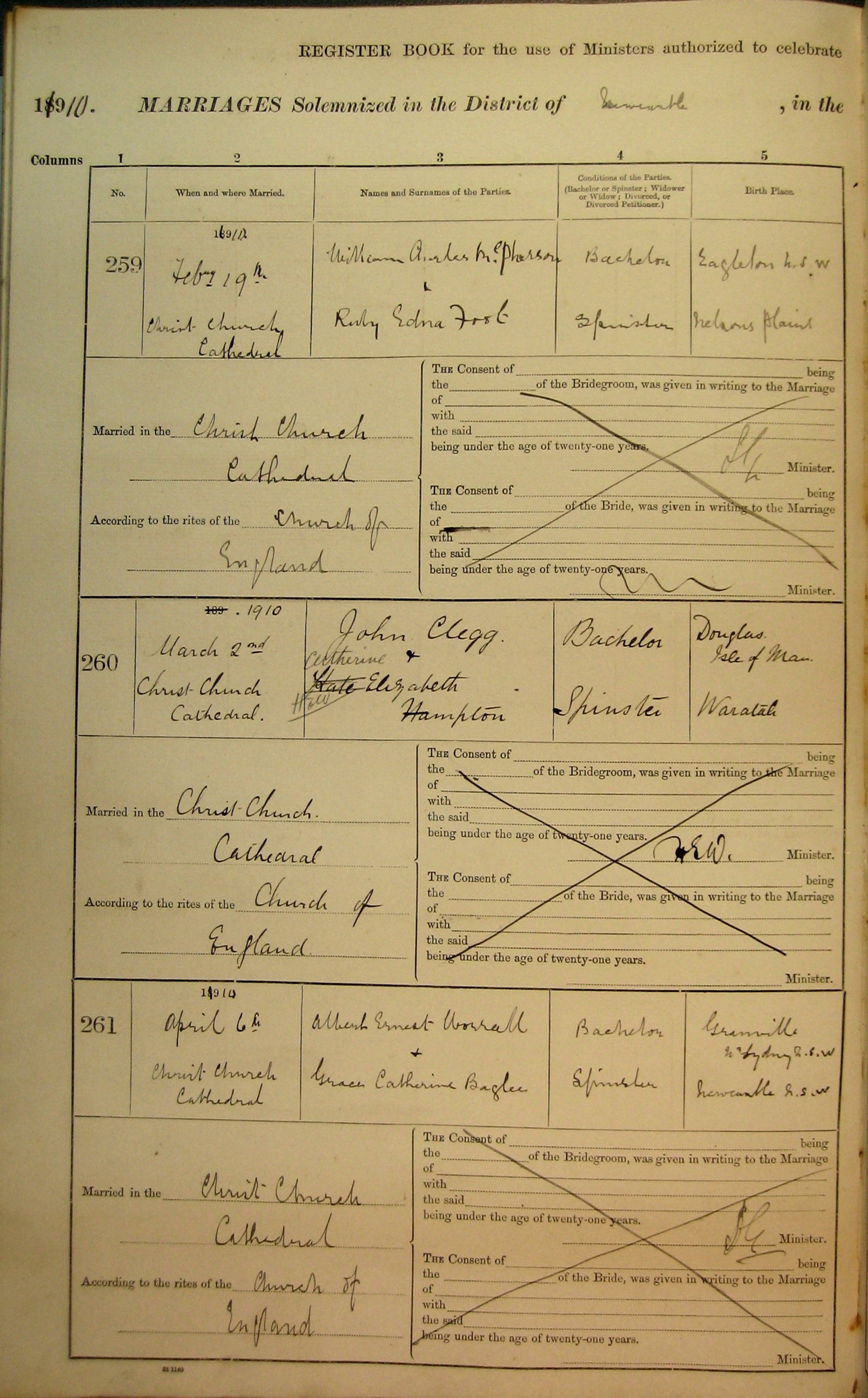 Marriage Numbers 259 to 261, Page 87. 1910