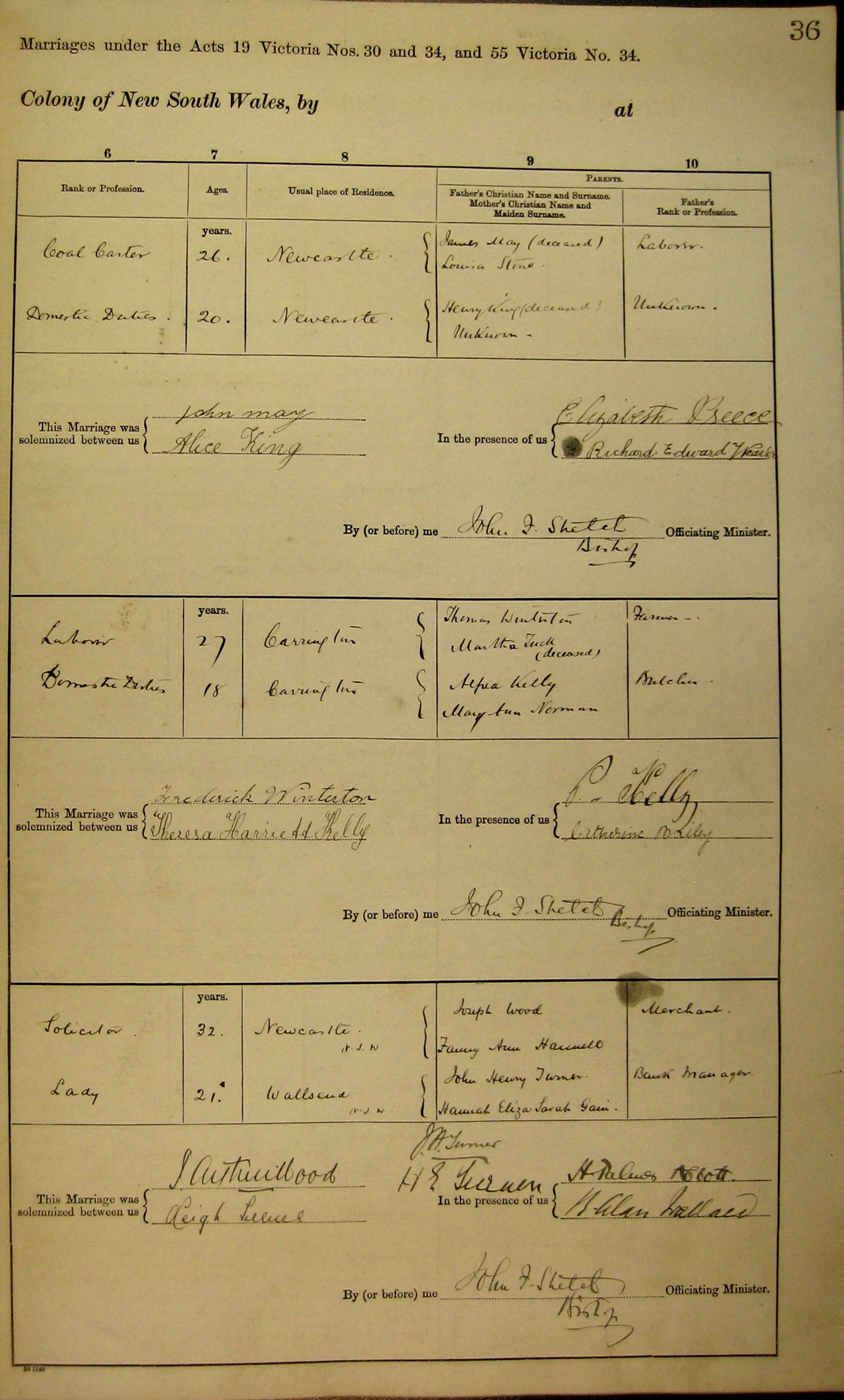 Marriage Numbers 106a to 108a, Page 36a. 1904. Living Histories, accessed 01/05/2026, https://livinghistories.newcastle.edu.au/nodes/view/51372