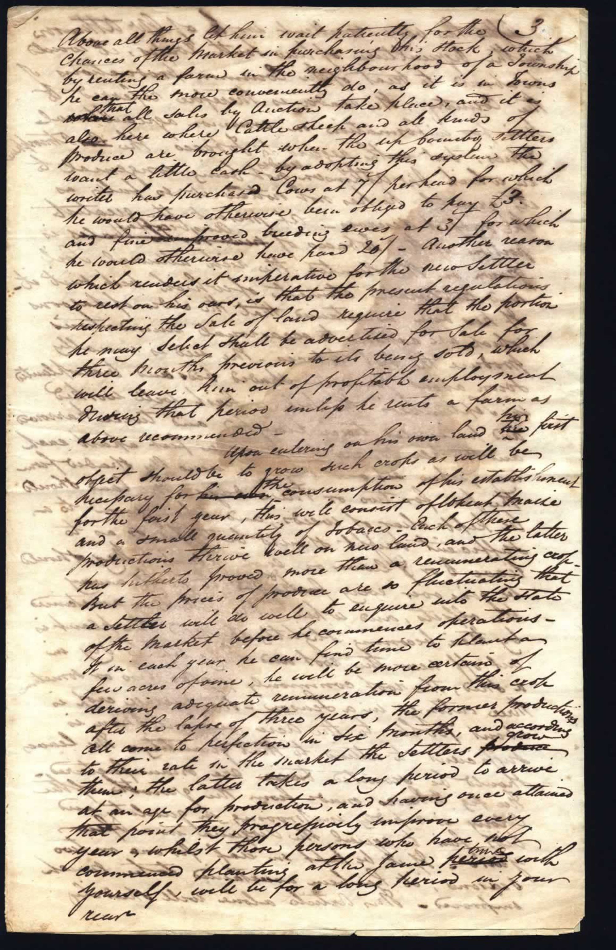 Above all things let him wait patiently for the chances of the market in purchasing his stock, which by renting a farm in the neighbourhood of a township he can the more conveniently do, as it is in towns that all sales by auction take place, and it is also here where cattle, sheep and all kinds of produce are brought when the up country settlers want a little cash - by adopting this system the writer has purchased cows at 7 [pounds] per head for which he would have otherwise been obliged to pay 3 [pounds] and fine improved breeding ewes at 3 [pounds] for which he would otherwise have paid 20 [pounds] Another reason which renders it imperative for the new settler to rest on his oars, is that the present regulations respecting the sale of land require that the portion he may select shall be advertised for sale for three months previous to its being sold, which will leave him out of profitable employment during that period unless he rents a farm as above recommended.