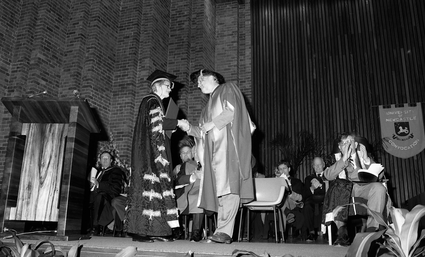 Graduation Ceremony - Chancellor Elizabeth Evatt introduces an unidentified speaker, the University of Newcastle, Australia - 7 May 1993 (7th May 1993), [B16372.93.079.2]. Living Histories, accessed 25/01/2026, https://livinghistories.newcastle.edu.au/nodes/view/5188