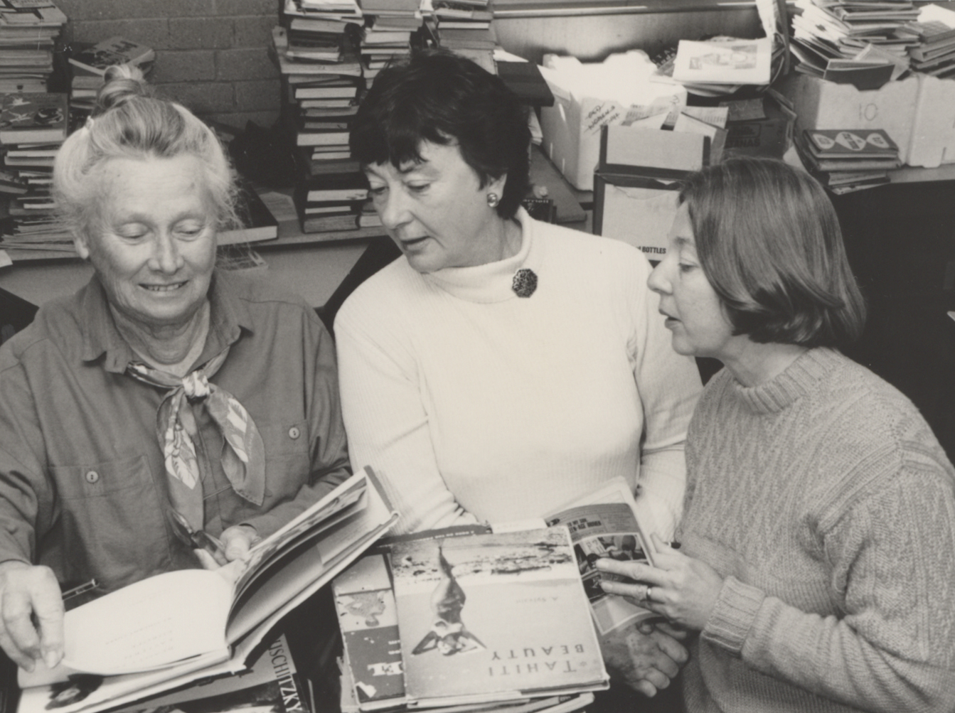 Pat Flowers pictured with two other ladies preparing for a book fair, the University of Newcastle, Australia, 1985