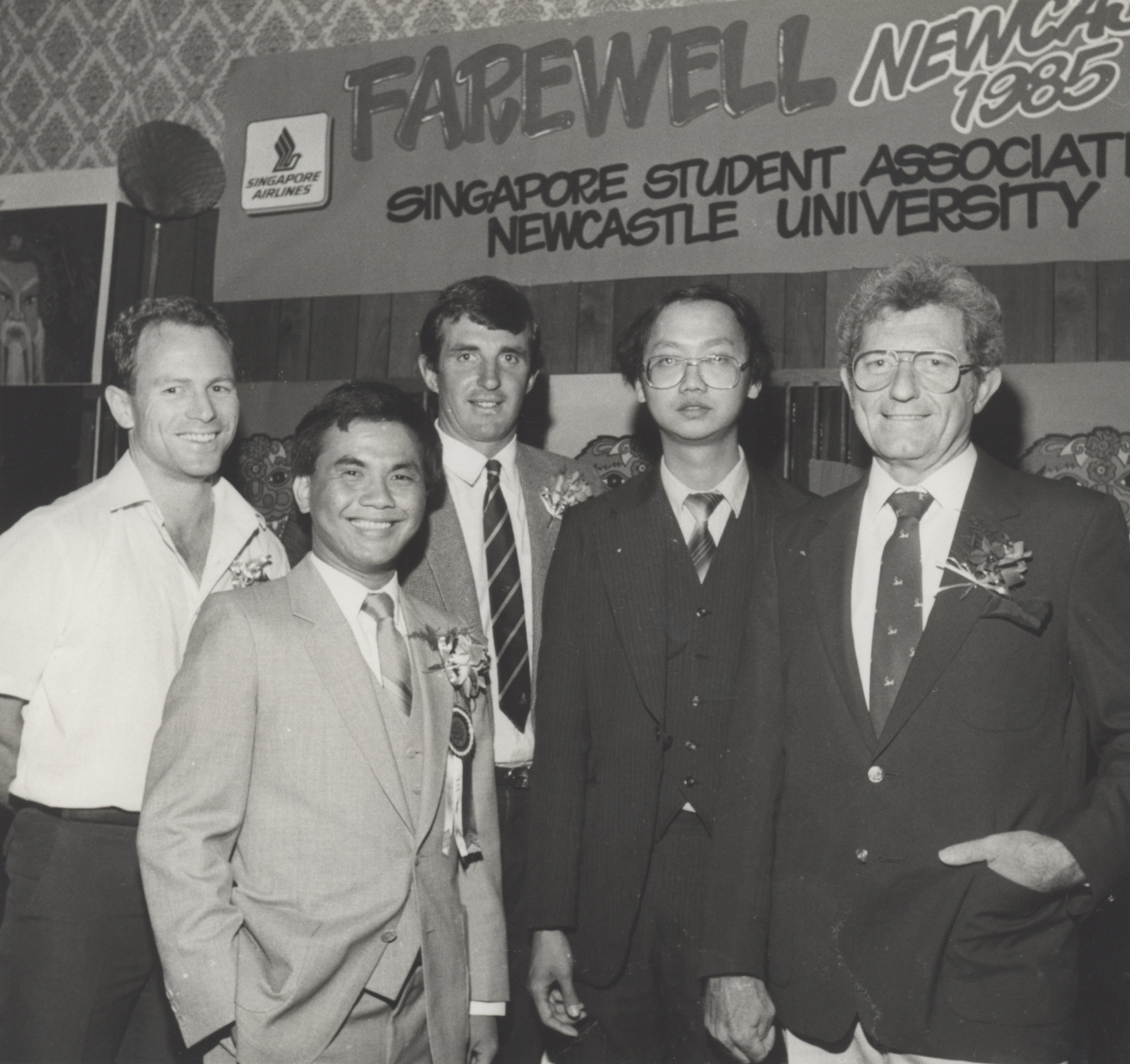 Ross Wisehart (Singapore Airlines), Heng Hock Heng (Singapore Students' Association), John Jenkins (Jayes Travel), Alex Ngian (SSA) and John Armstrong (Convocation) at the farewell dinner, the University of Newcastle, Australia - 1985