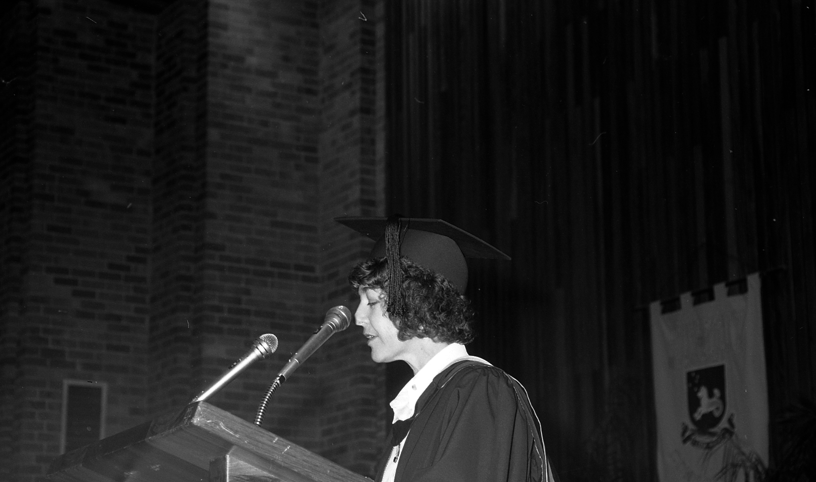 Graduation Ceremony - Professor Jenny Graham introduces Dr. Colin Glass (Honorary Degree recipient) to the graduation ceremony audience, the University of Newcastle, Australia - 1 May, 1993 (1st May 1993), [B16372.93.076.19]. Living Histories, accessed 16/04/2026, https://livinghistories.newcastle.edu.au/nodes/view/5253