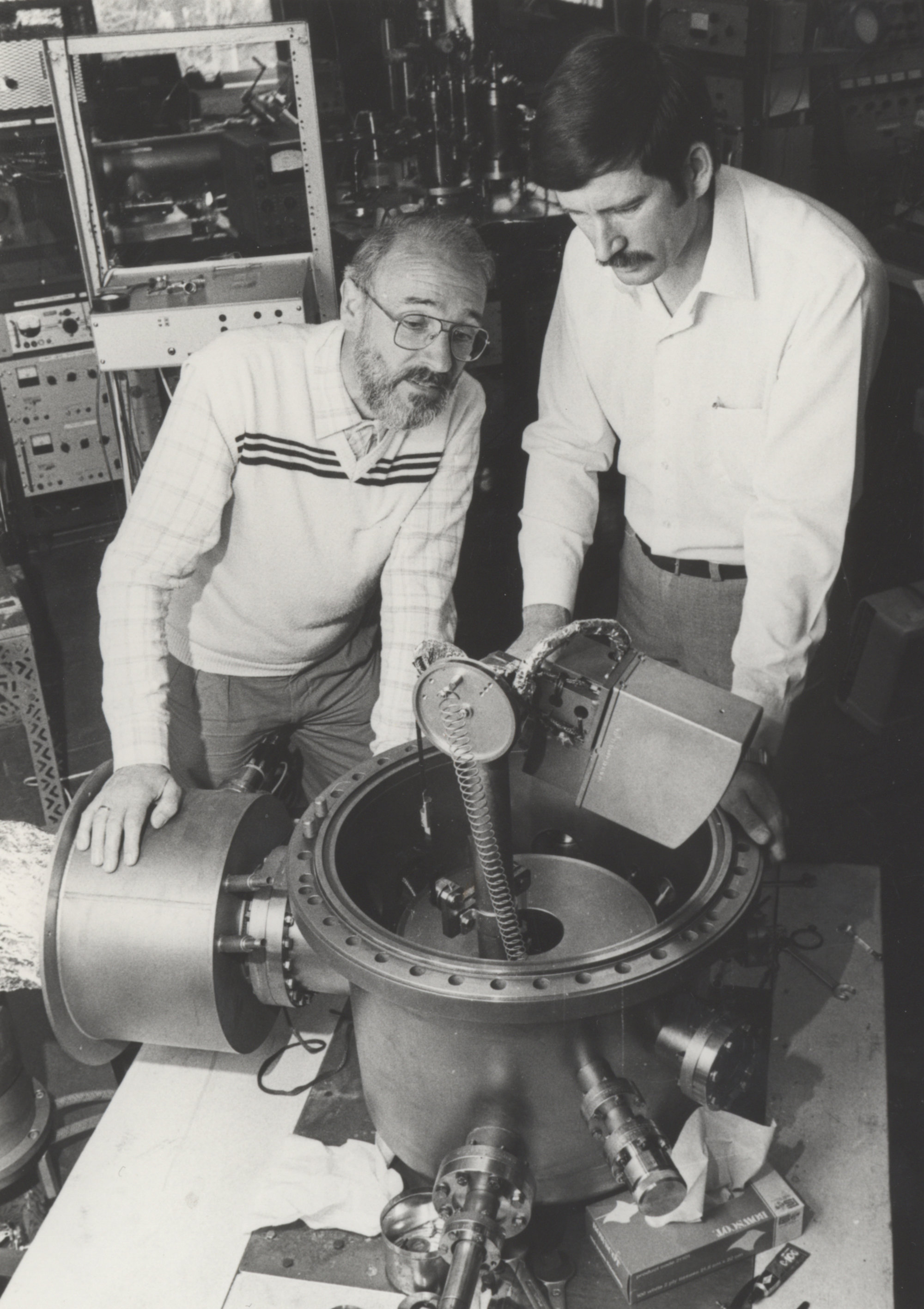 Professor Ron MacDonald and Dr. John O'Connor, working with apparatus used for the location of atoms on surfaces by low energy ion scattering: the University of Newcastle, Australia