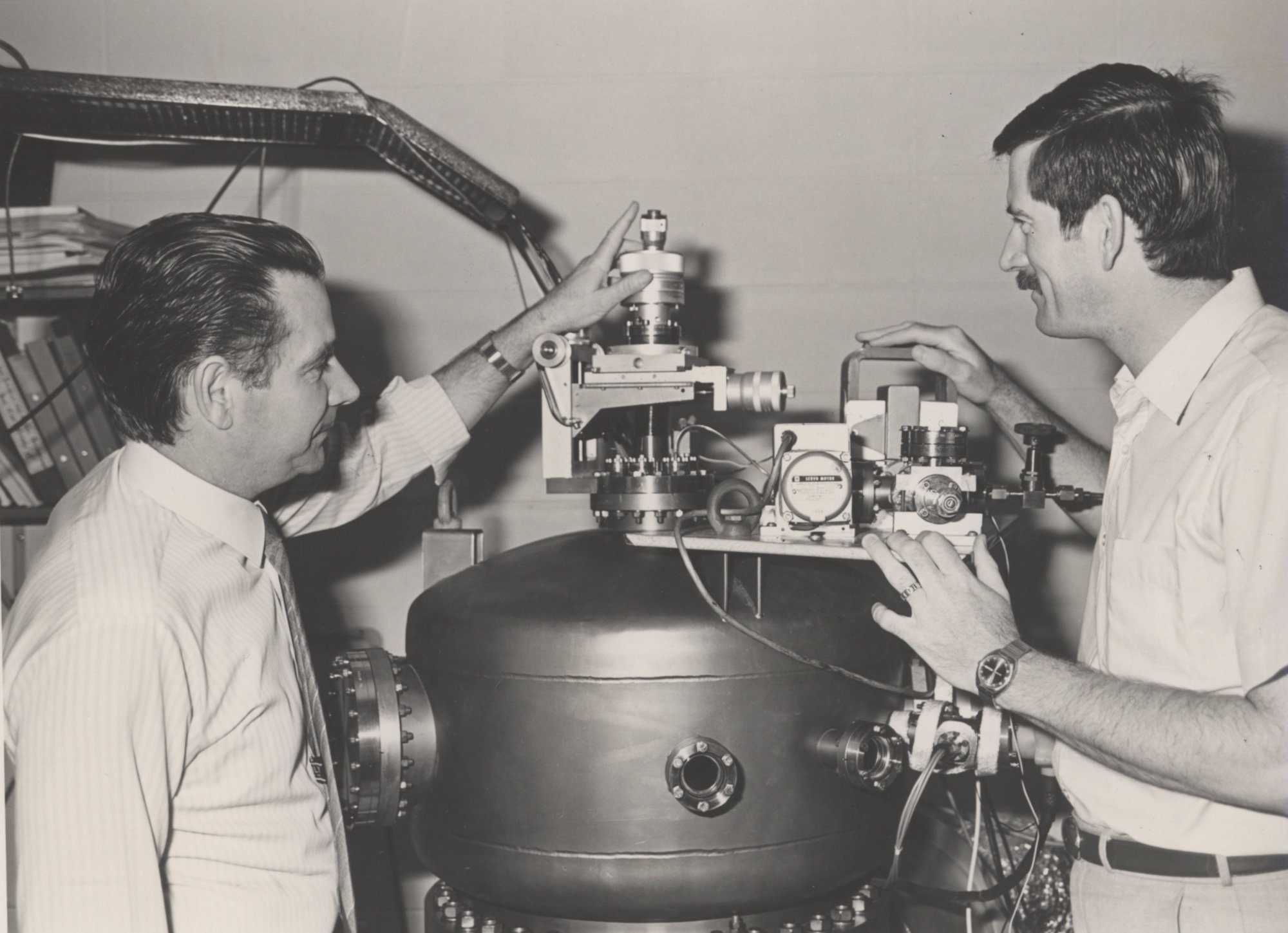 Professor Ron MacDonald and Dr. John O'Connor, working with an apparatus used for the location of atoms on surfaces by low energy ion scattering: the University of Newcastle, Australia