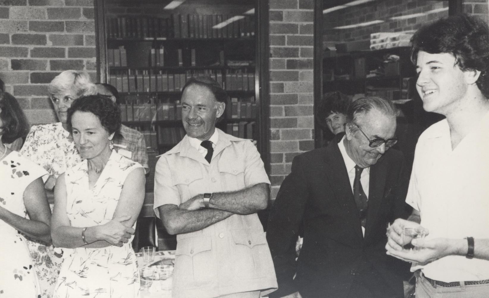 L-R: Joan Murray?, Karina Sanders, [?], Ken Dutton, [?], James Auchmuty, Richard Murray: photograph taken at the 20th anniversary celebrations of the appointment of Mr. E. Flowers as Librarian, University of Newcastle, May, 1981 (1981), [P397t]. Living Histories, accessed 04/04/2026, https://livinghistories.newcastle.edu.au/nodes/view/52747