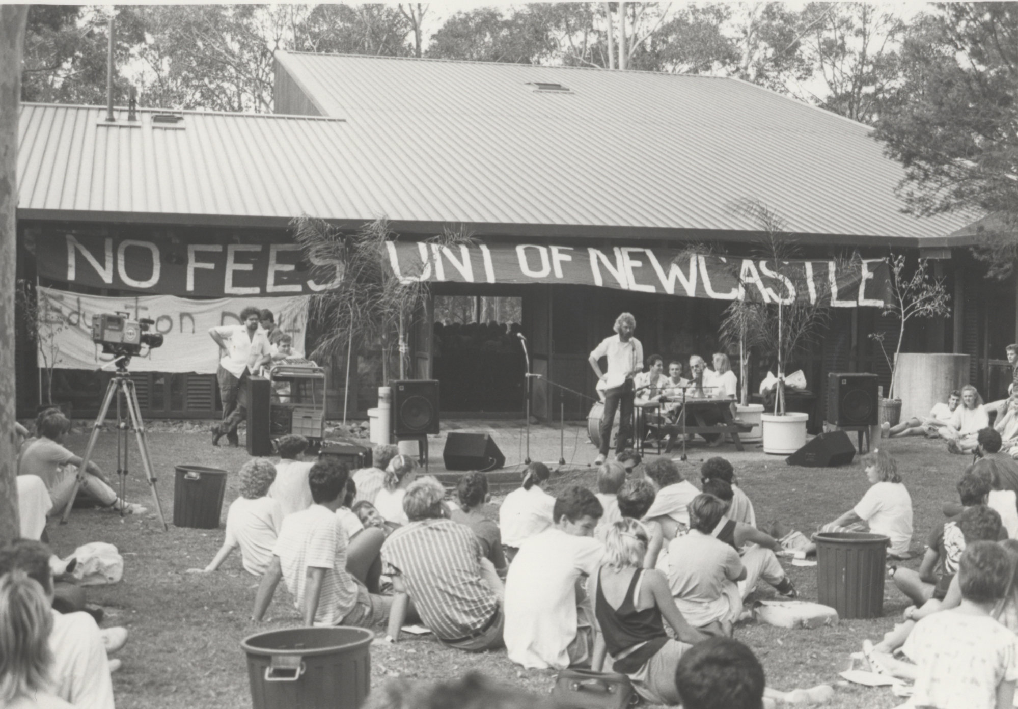 No Fees Campaign - At the microphone is Students Representative Council President Chris Craig. Glenn Stuart Beatty (seen on left) manning the sound desk, the University of Newcastle, Australia - 1988, [P605]. Living Histories, accessed 15/04/2026, https://livinghistories.newcastle.edu.au/nodes/view/52896