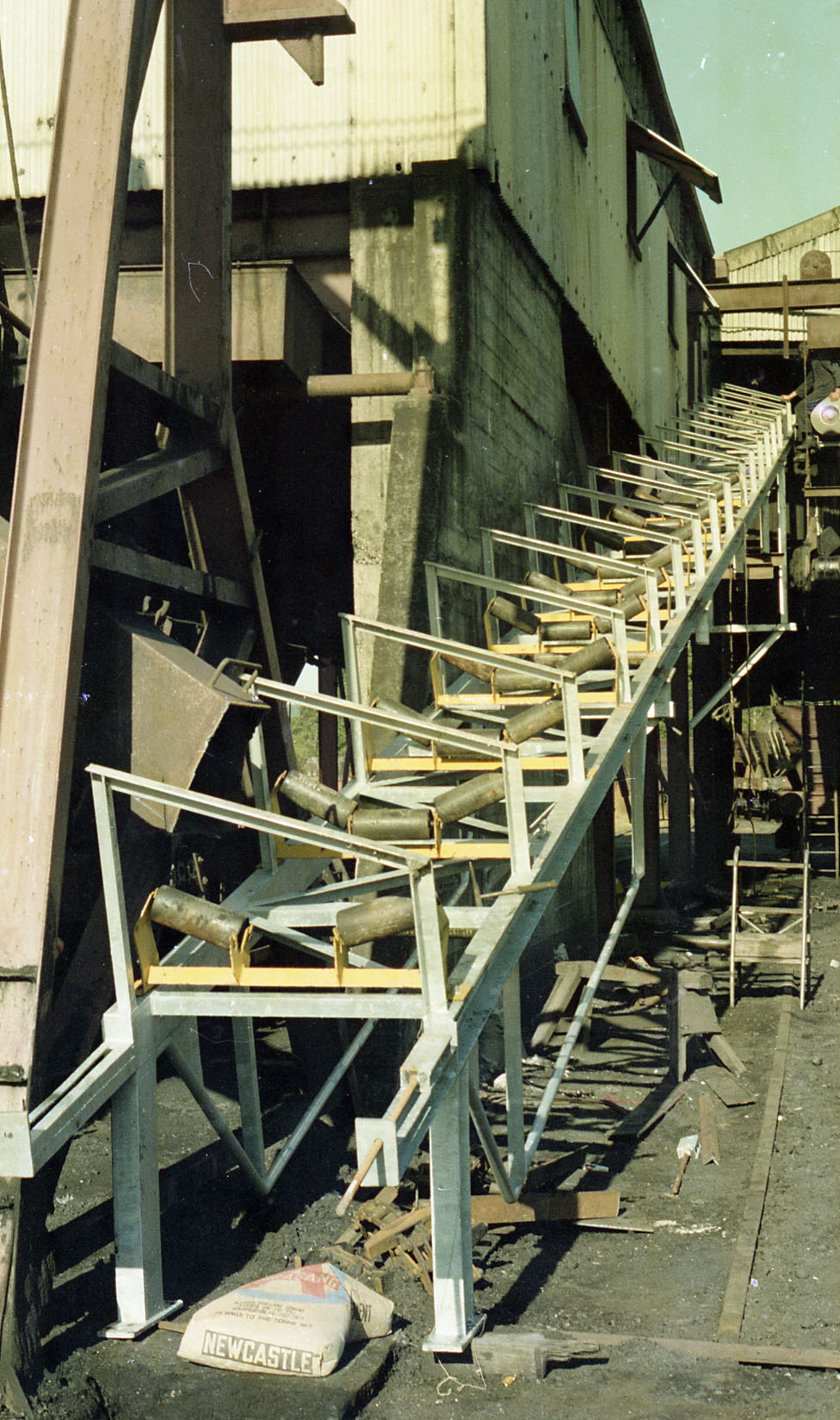 Cobbles Return Conveyor under construction, Stockrington No. 2 Colliery screens, NSW, May 1976